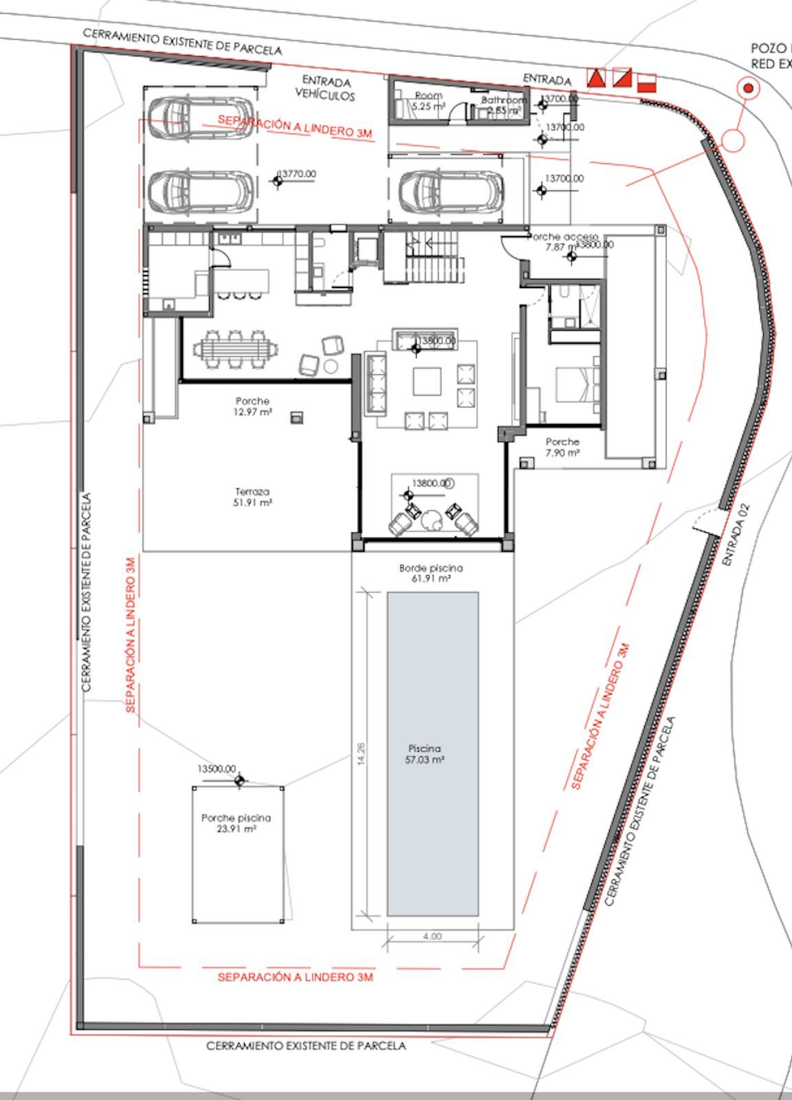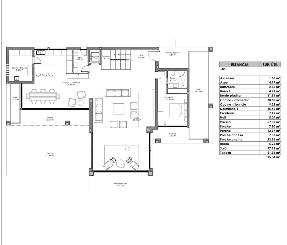 La planta baja está diseñada en 395 m2, este tamaño incluye la piscina y las terrazas, y consta de una gran sala de estar de planta abierta de 77 m2 con techo de doble altura y enormes ventanales de suelo a techo. Impresionante arquitectura que enmarca la preciosa piscina y zona ajardinada exterior.