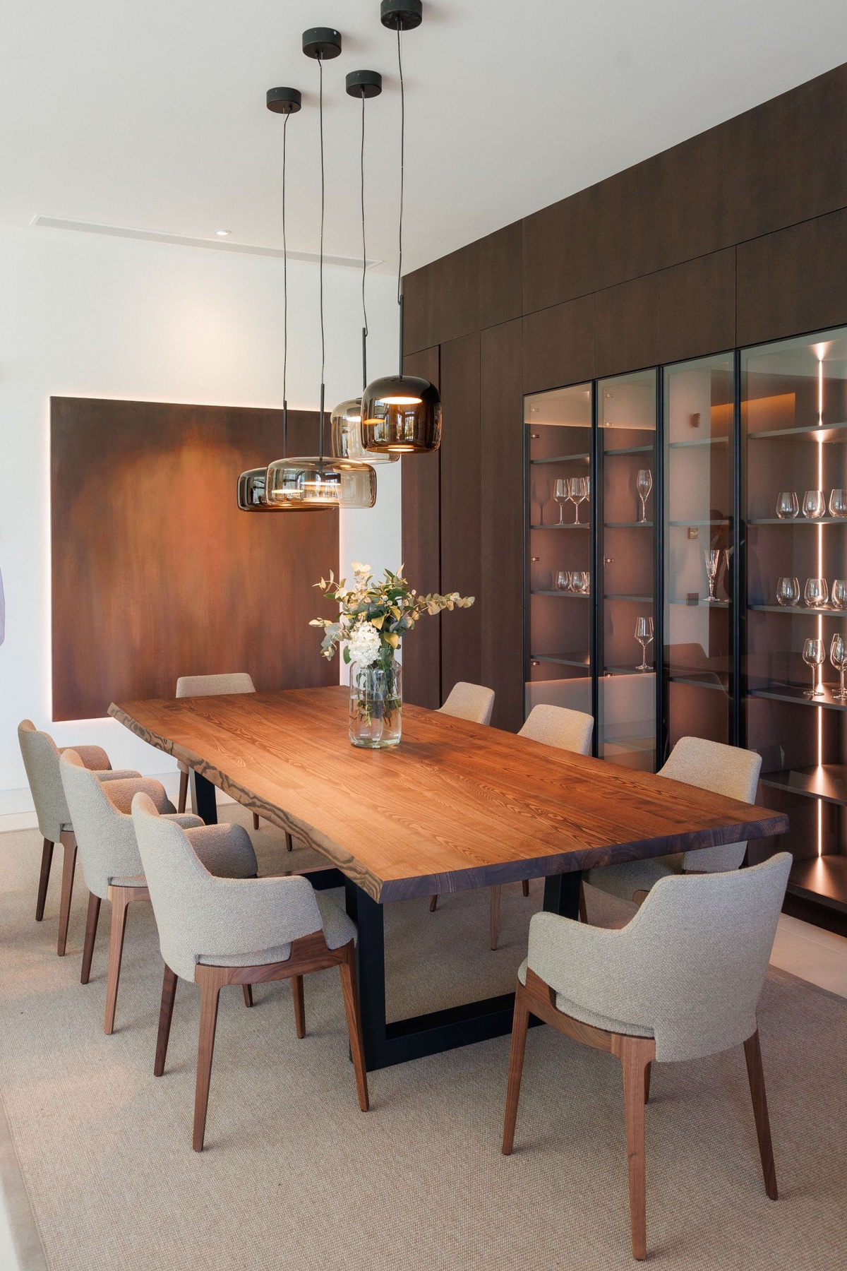 El nivel de planta baja ofrece 3 dormitorios, 2 baños y 1 aseo de invitados, un amplio salón con comedor integrado y una cocina totalmente equipada con encimera, iluminación, mobiliario y electrodomésticos de primera marca y diseño actual: frigorífico, horno, microondas, lavavajillas, lavadora-secadora integrable, fregadero, grifería, placa de inducción y campana. Marca GAGGENAU o similar. El salón tiene el acceso directo al jardín privado y la zona de piscina y zona de barbacoa.