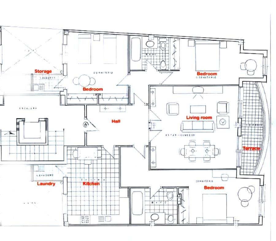 La propiedad dispone de tres dormitorios, ofreciendo un espacio cómodo y acogedor para toda la familia. Dos de los dormitorios tienen vistas al mar y el dormitorio principal incluye un baño en suite, proporcionando privacidad y confort. Los otros dos dormitorios comparten un baño adicional, ambos equipados con acabados de calidad y suelos de porcelana. El tercer dormitorio en cambio de tamaño generoso cuenta con un pequeño cuarto de almacenamiento adicional.