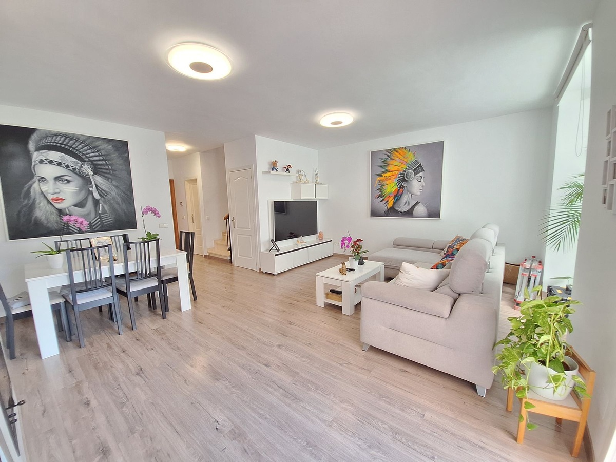 También en este nivel tiene escaleras que descienden al garaje y al lavadero. La sala de estar ofrece un lugar cómodo para relajarse, con un comedor separado. Mucha luz natural desde su orientación sur, asegura sol todo el día. Desde aquí se accede a la terraza privada, con mucho espacio para entretenerse. Hay acceso directo a la piscina comunitaria, por lo que es segura para los niños y los residentes. En la planta superior tiene 3 dormitorios, la suite principal tiene acceso a x 2 terrazas (orientación sur y vistas a la piscina), también persianas manuales. El segundo dormitorio tiene una terraza con balcón Juliette. Los 3 dormitorios tienen un diseño moderno. Otro baño familiar moderno con bañera y ducha en este nivel. CARACTERÍSTICAS IMPORTANTES: La propiedad se puede ampliar a la zona de solárium, mediante la construcción de una escalera interior que le permite construir un dormitorio adicional, un baño con el uso de la terraza privada). MOBILIARIO OPCIONAL Y EL IBI INCLUYE LOS GASTOS DE BASURA.