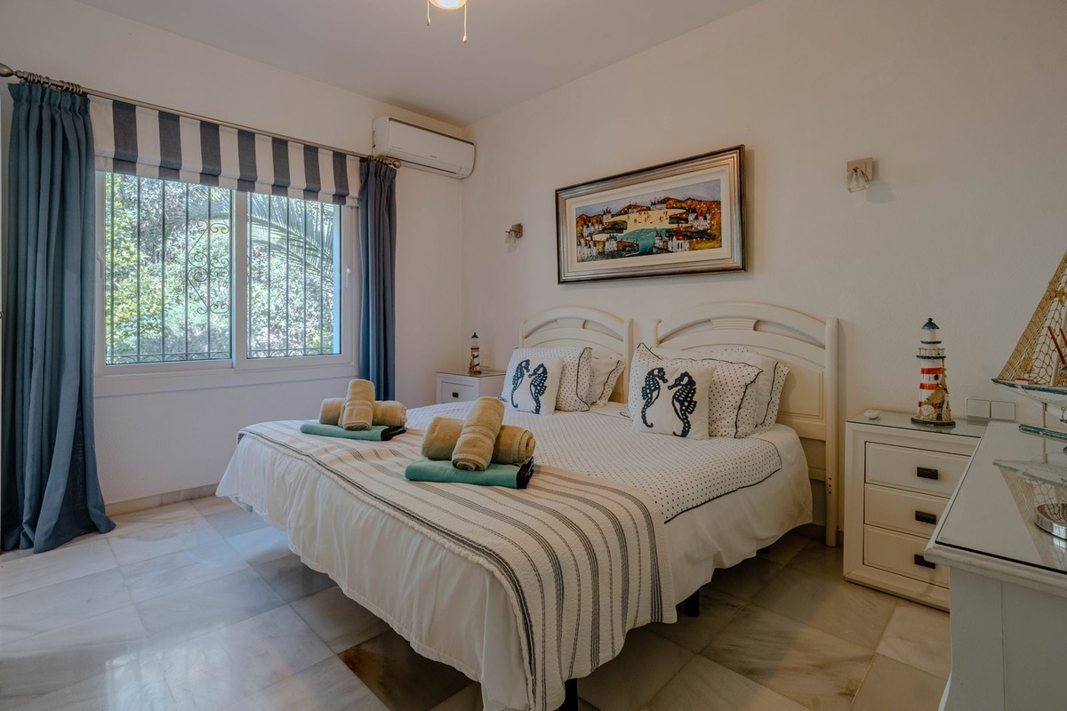 Los cuatro dormitorios son amplios y cuentan con armarios empotrados. Cada uno tiene grandes ventanales que proporcionan mucha luz natural. El dormitorio principal y el dormitorio de invitados principal tienen baño en suite; los otros dos dormitorios dobles comparten un baño familiar. Todos los baños han sido renovados en los últimos años, manteniendo la estética de la villa.