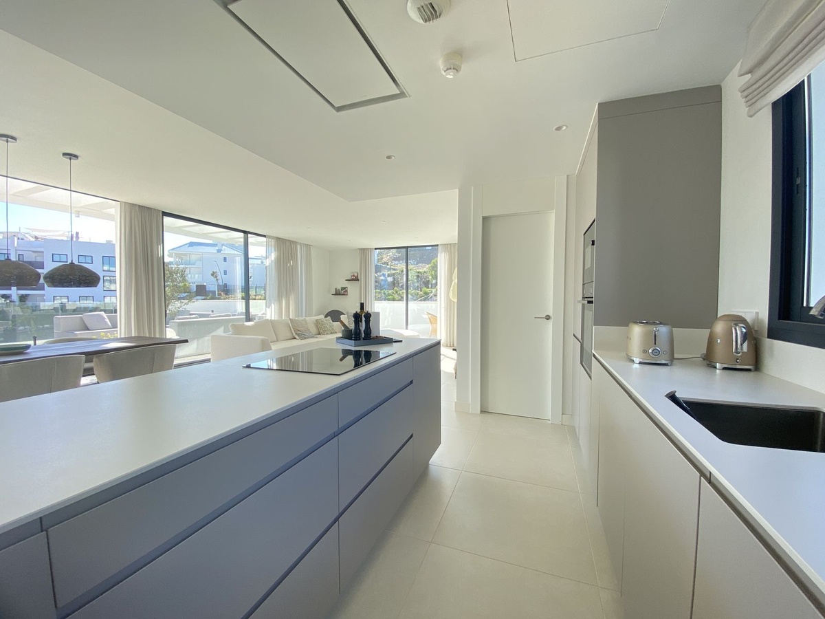 En su interior, el ático ofrece una atmósfera luminosa y acogedora, con una amplia cocina de concepto abierto y una zona de estar inundada de luz natural. Grandes puertas correderas de cristal se abren directamente a la terraza, creando una transición fluida entre los espacios interiores y exteriores, perfecta para relajarse o recibir invitados.