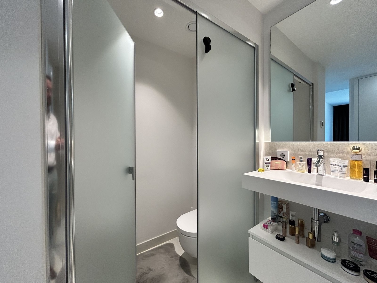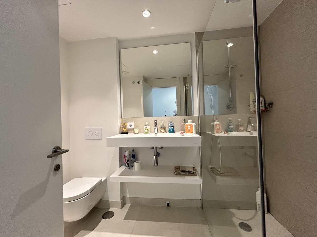 El dormitorio principal es una suite de 15 m² con un vestidor y un baño privado dividido en tres espacios: un inodoro separado, lavamanos dobles y una gran cubícula de ducha.