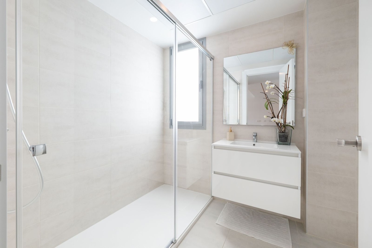 El apartamento presenta un diseño moderno de planta abierta, con un salón espacioso que se conecta a una terraza privada con vistas al jardín. El interior está diseñado para aprovechar al máximo la luz natural, con grandes ventanales y acabados en tonos neutros que realzan la amplitud. La cocina está completamente equipada con electrodomésticos de calidad e integrada en la zona de estar para una distribución fluida. Dispone de dos dormitorios cómodos y dos baños, uno de ellos en suite, lo que lo hace apto tanto para vivir todo el año como para disfrutar durante las vacaciones.