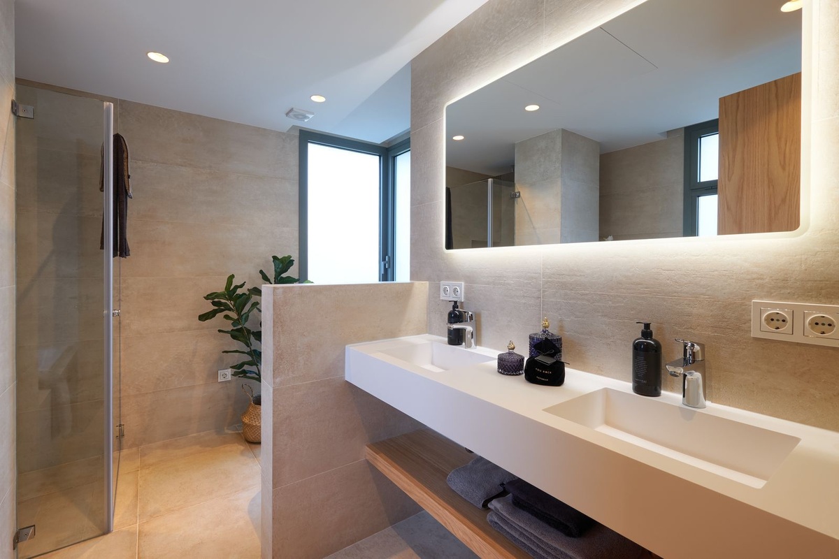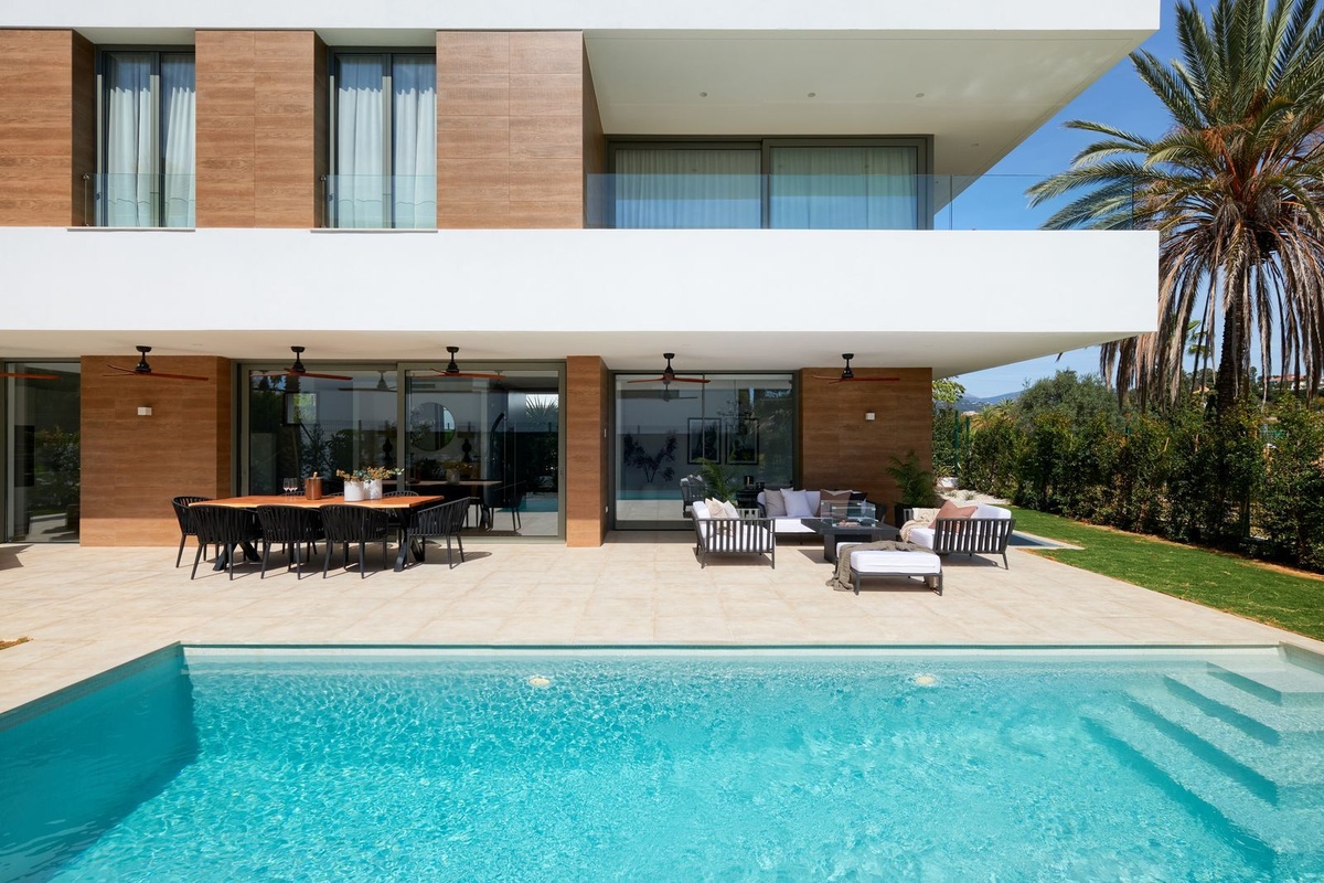 Moderna villa de 6 dormitorios con orientación sur en primera línea de golf, ubicada en El Campanario, Estepona Este, a poca distancia en coche de playas, diversos campos de golf, San Pedro de Alcántara, Puerto Banús y el centro de Estepona. Distribuida en tres plantas, la villa consta de recibidor, aseo de invitados, cocina americana totalmente equipada, salón-comedor con acceso directo a la terraza cubierta con zonas de estar y vistas a la piscina y al cuidado jardín. En la planta superior, se encuentran cuatro dormitorios dobles, dos de ellos con baño en suite y dos dormitorios que comparten un baño familiar. Desde esta planta, se accede al amplio solárium con barbacoa de obra, jacuzzi, zona cubierta ideal para comer al aire libre y vistas al campo de golf. En la planta baja, se encuentra una amplia sala de estar/entretenimiento, dos dormitorios de invitados que comparten un baño, lavadero y trastero. Situada junto al Club El Campanario, donde hay gimnasio, restaurante, piscina cubierta y un campo de golf de 9 hoyos.