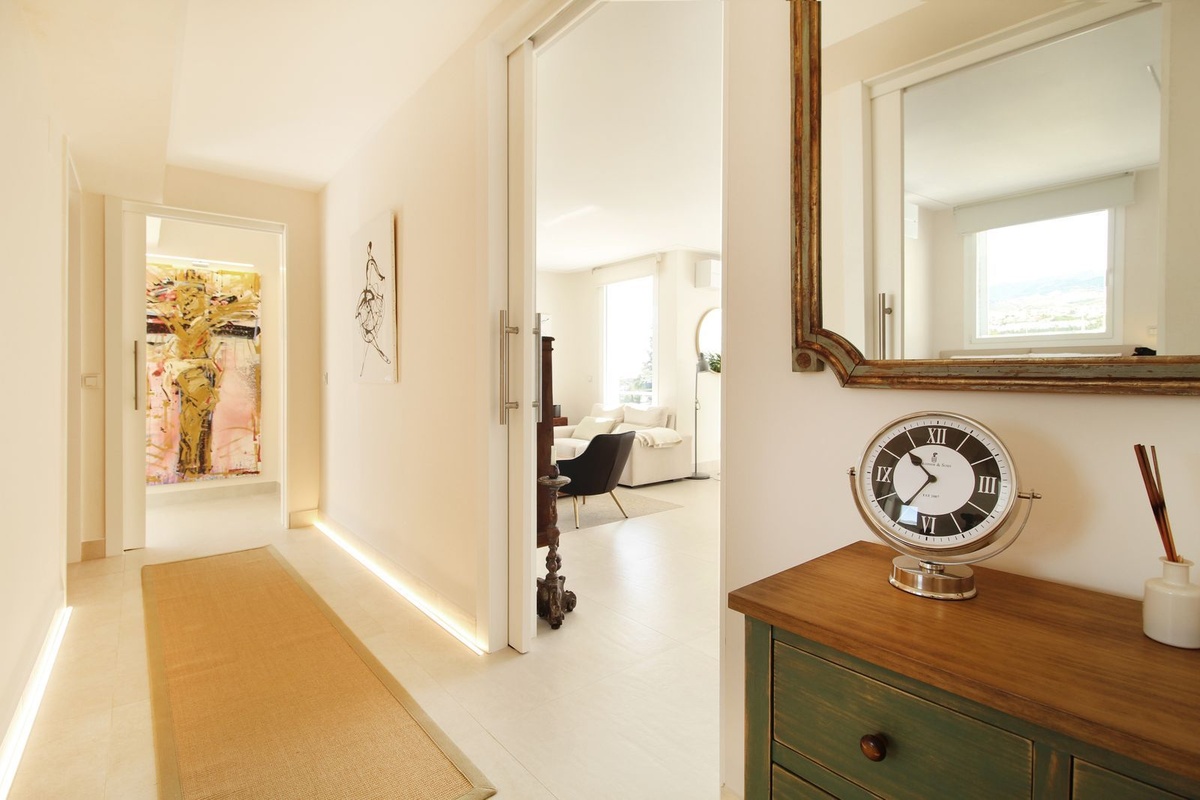 Desde el momento en que ingresa al pasillo, la atmósfera luminosa y aireada que llena esta excepcional casa en esquina le da la bienvenida.A la derecha, el salón de doble aspecto es espacioso e inundado de luz natural, con múltiples puntos de acceso a las terrazas.Desde aquí podrá disfrutar de impresionantes vistas panorámicas del mar Mediterráneo, el campo de golf de Guadalmina y la emblemática montaña de La Concha.