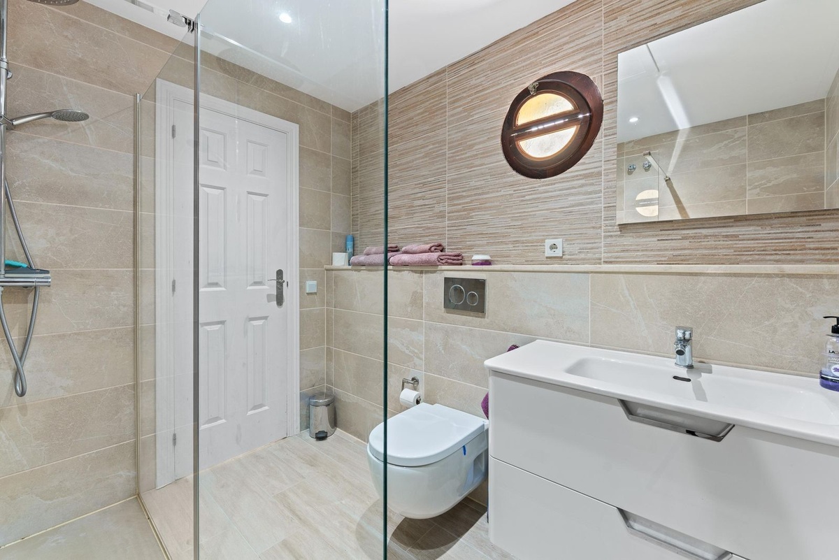 La vivienda, en excelente estado de conservación, cuenta con una superficie construida de 128 m² distribuidos en dos plantas, dos dormitorios y dos baños completos. En la planta baja encontramos un amplio salón con cocina abierta y un aseo de cortesía, con salida directa a una terraza privada perfecta para disfrutar del clima de la Costa del Sol. En la planta alta se sitúan los dos dormitorios, todos exteriores y luminosos, con dos baños completos, incluido un baño en suite en el dormitorio principal. La propiedad dispone de plaza de garaje incluida y acceso a zonas comunes con piscina y jardines bien cuidados.