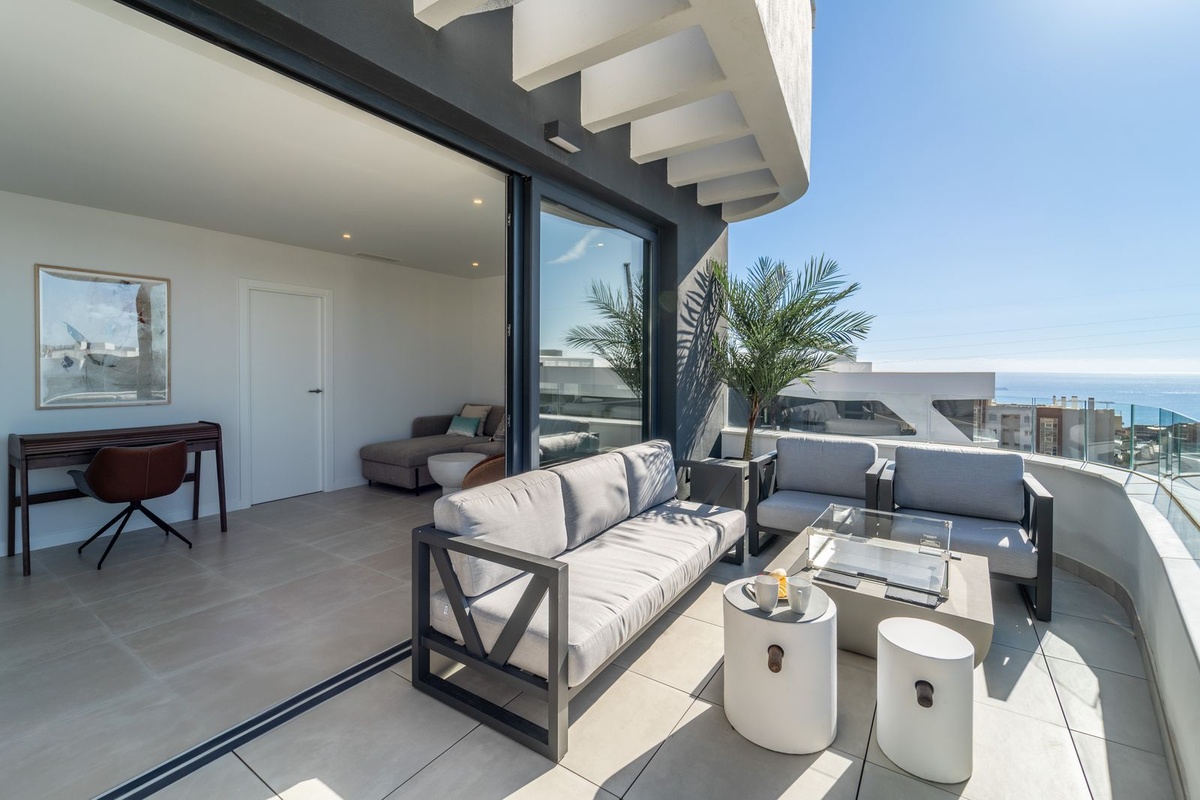 Este ático de ensueño en la última planta combina diseño moderno, amplitud y vistas espectaculares al Mediterráneo y a la montaña. Forma parte del exclusivo par de “apartamentos gemelos” conectados por terraza compartida, disponibles juntos o por separado.