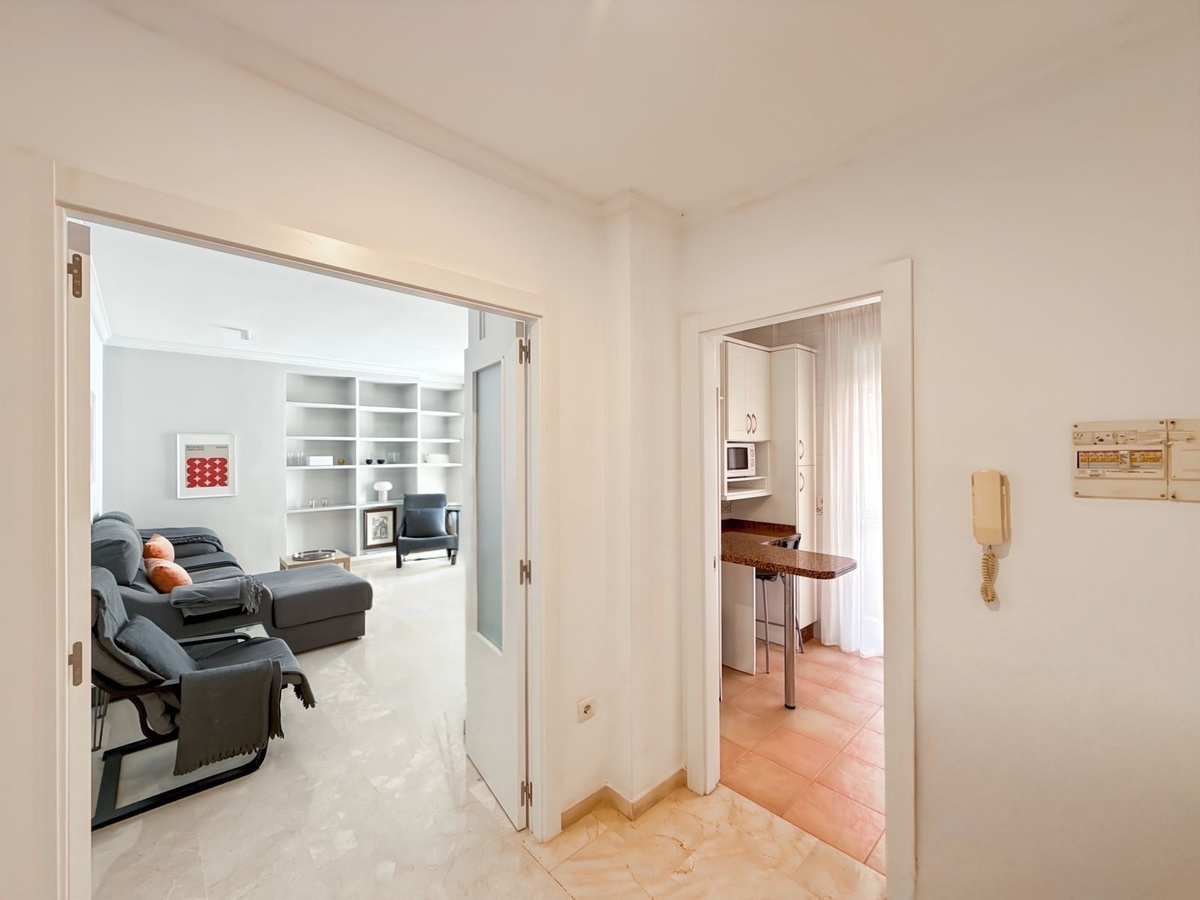 La vivienda, situada en una primera planta sin ascensor, sorprende por su luz y amplitud. Los techos de 2,8 metros realzan la sensación de espacio, mientras que el salón se abre a dos balcones a la calle, bañándolo de claridad y vida. La cocina, independiente y equipada, también cuenta con su propio balcón, un detalle que aporta frescura y ventilación natural.