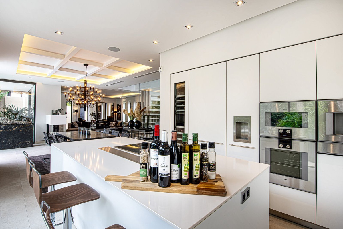 Inside, a bright and spacious living area features floor-to-ceiling windows opening directly to the terrace, garden and pool. A Bulthaup open-plan kitchen, fully fitted with the latest Gaggenau appliances, blends seamlessly into the space. A double-sided gas fireplace adds warmth and character, elegantly connecting the living and dining areas.