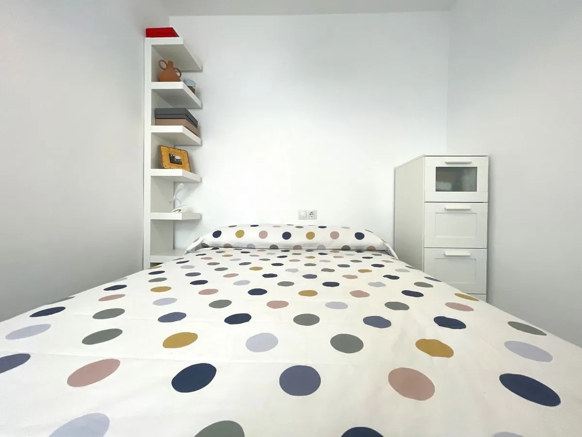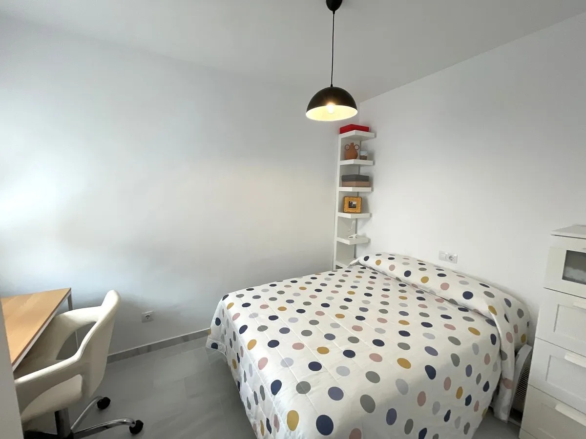 Dormitorio principal en suite, con baño privado reformado, bañera, suelos porcelánicos renovados y ventana exterior con reja, que aporta mayor luminosidad y privacidad.