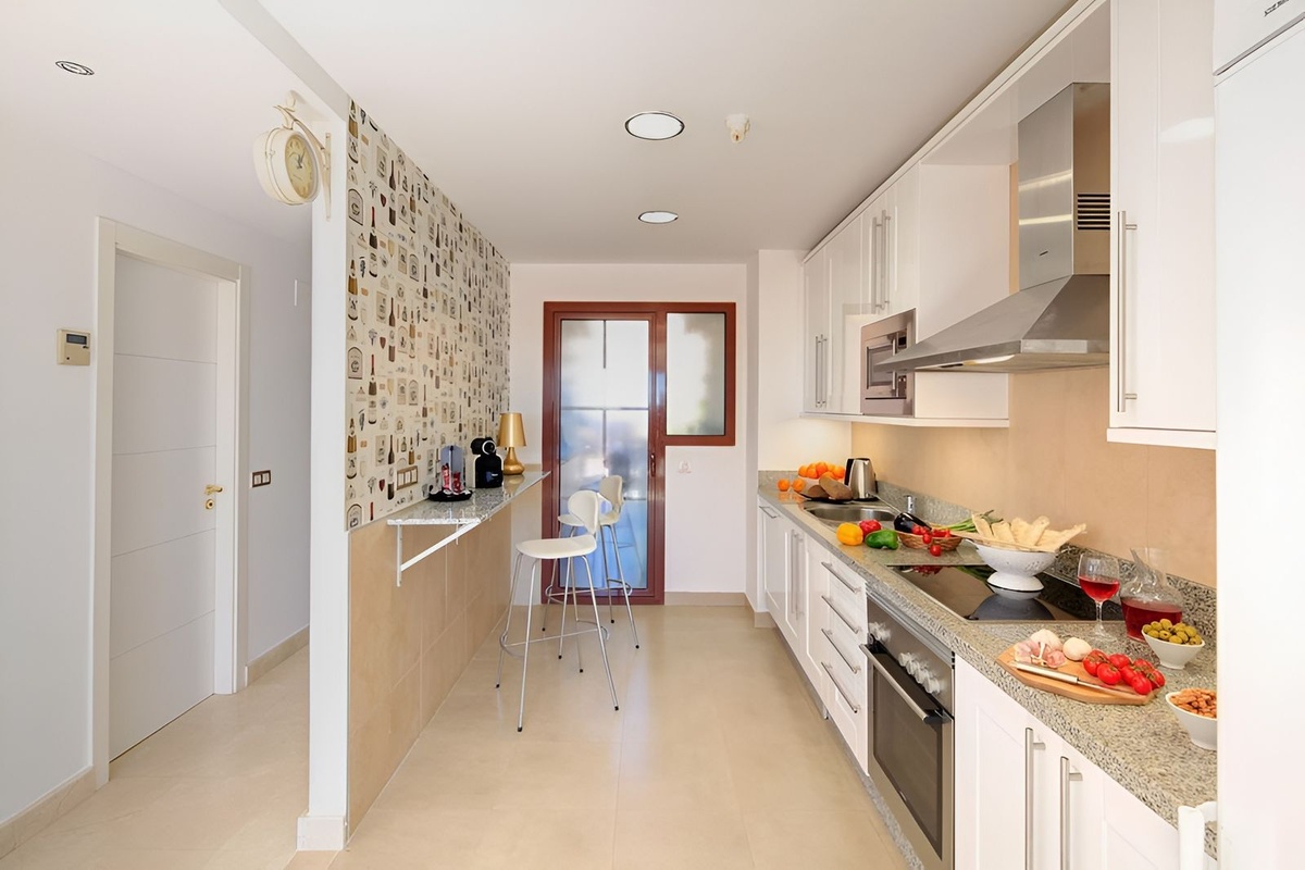 El dormitorio principal dispone de baño en suite y acceso directo a la terraza. Los otros dos dormitorios comparten un baño moderno. La vivienda está equipada con aire acondicionado frío/calor, suelos de mármol, armarios empotrados y acabados de alta calidad.