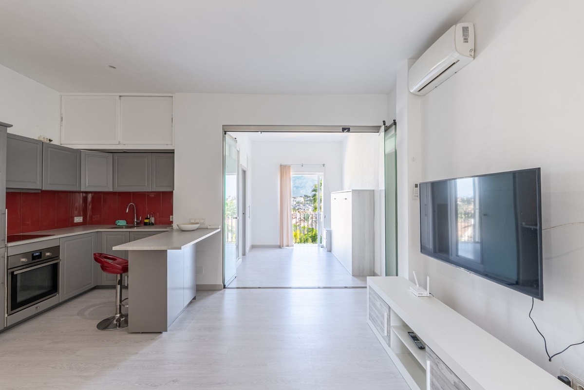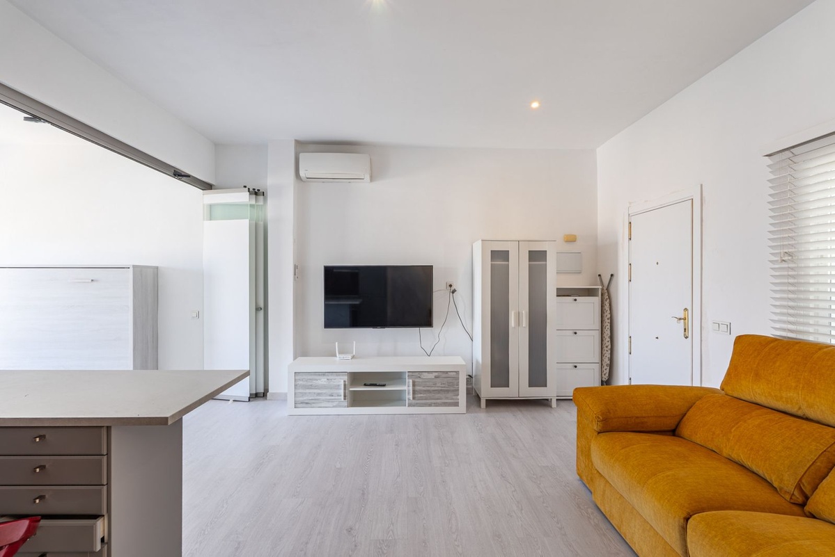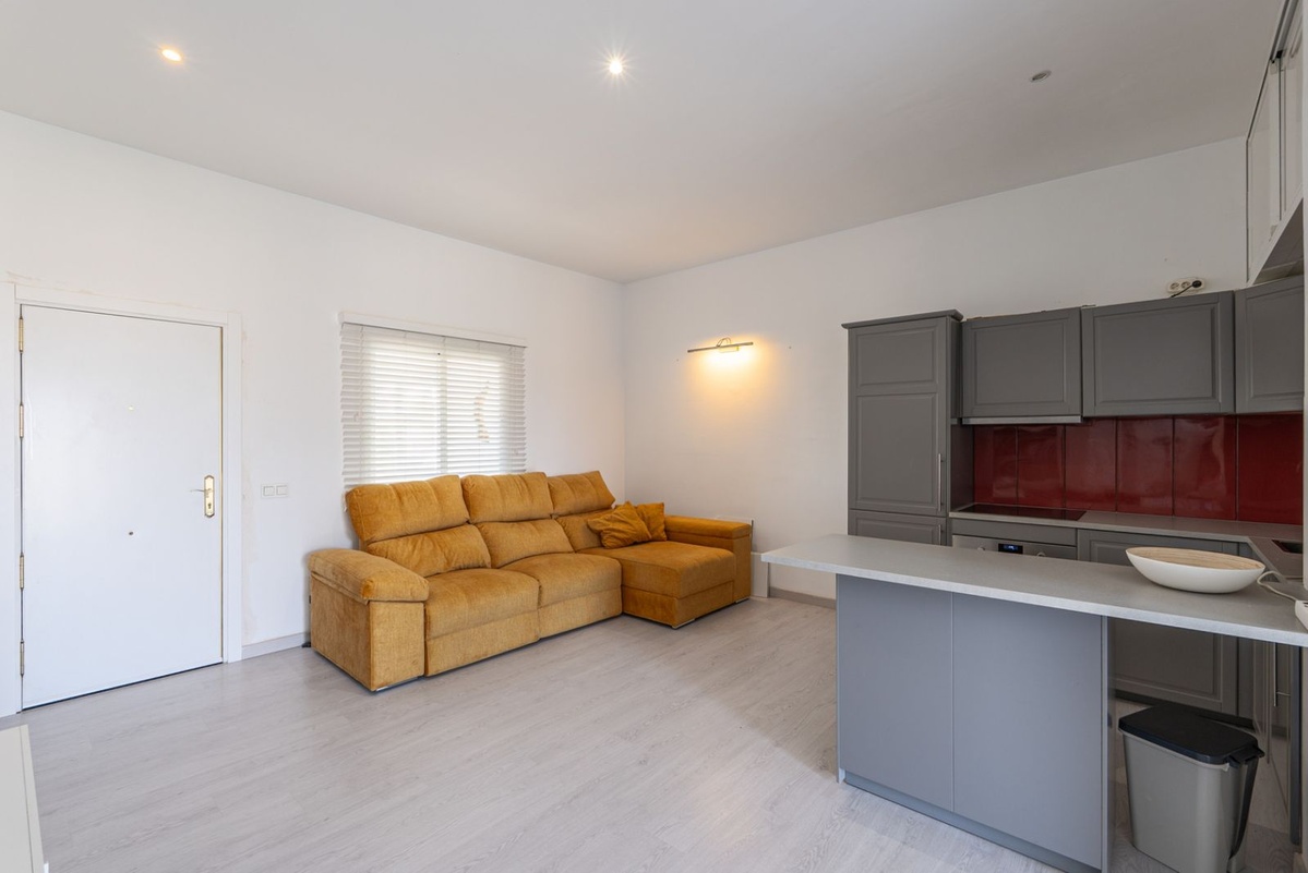 Acogedor apartamento situado en una tranquila urbanización cerrada en Benavista, Estepona. Con 46 m² construidos, ofrece un espacio luminoso de planta abierta con cocina totalmente equipada y un baño moderno.