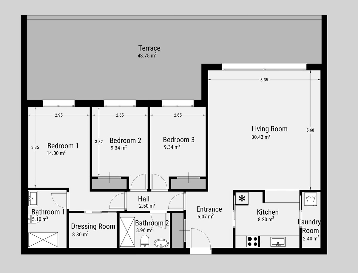 El apartamento cuenta con tres dormitorios, cada uno con acceso directo a la terraza, creando un estilo de vida interior-exterior sin interrupciones. La distribución de planta abierta y los acabados modernos otorgan a la propiedad una sensación fresca y elegante en todos sus espacios.