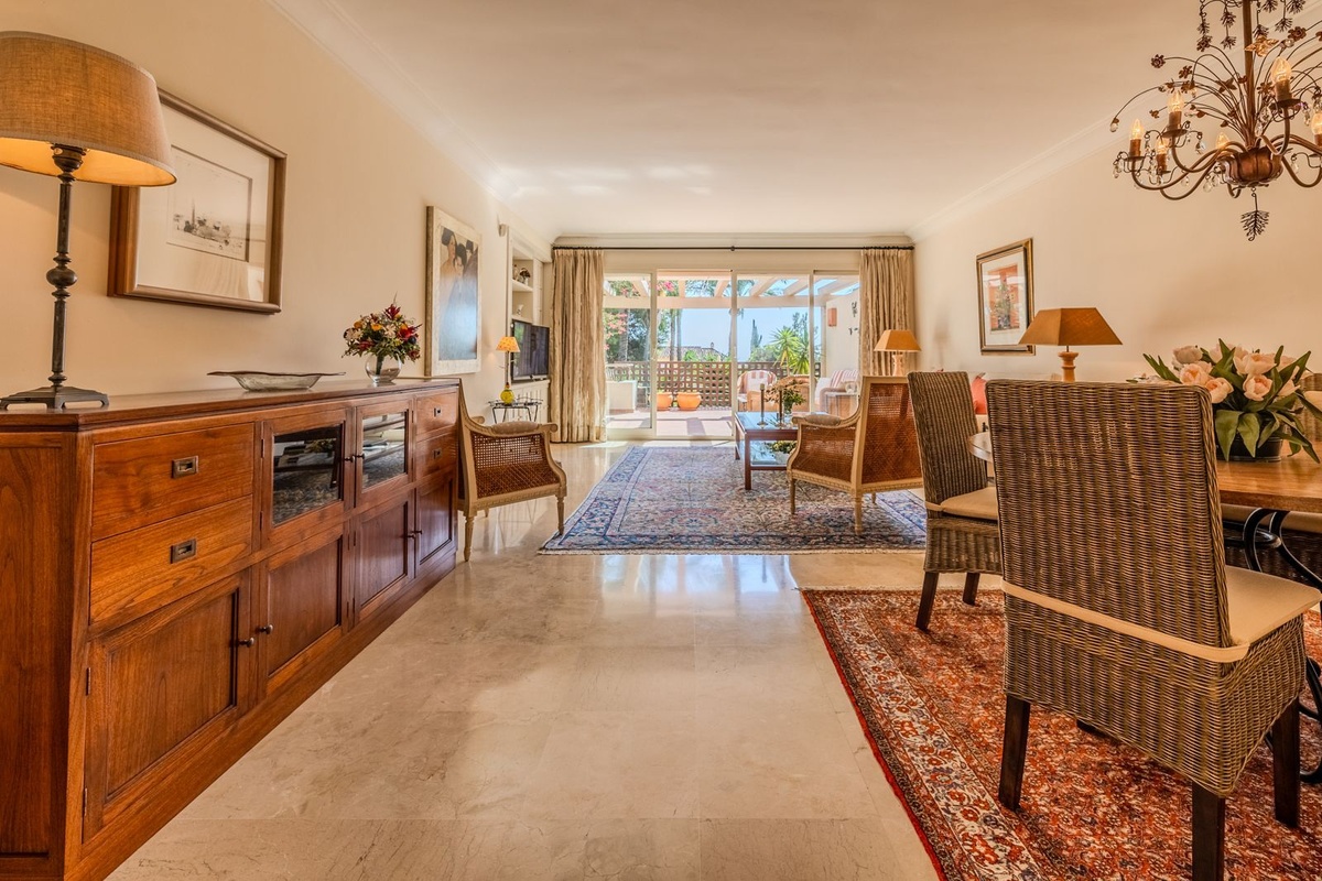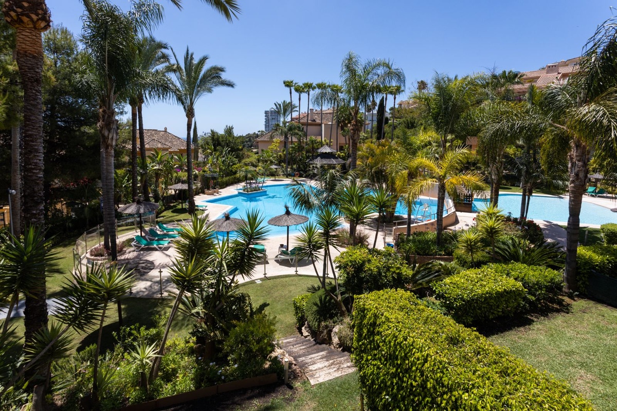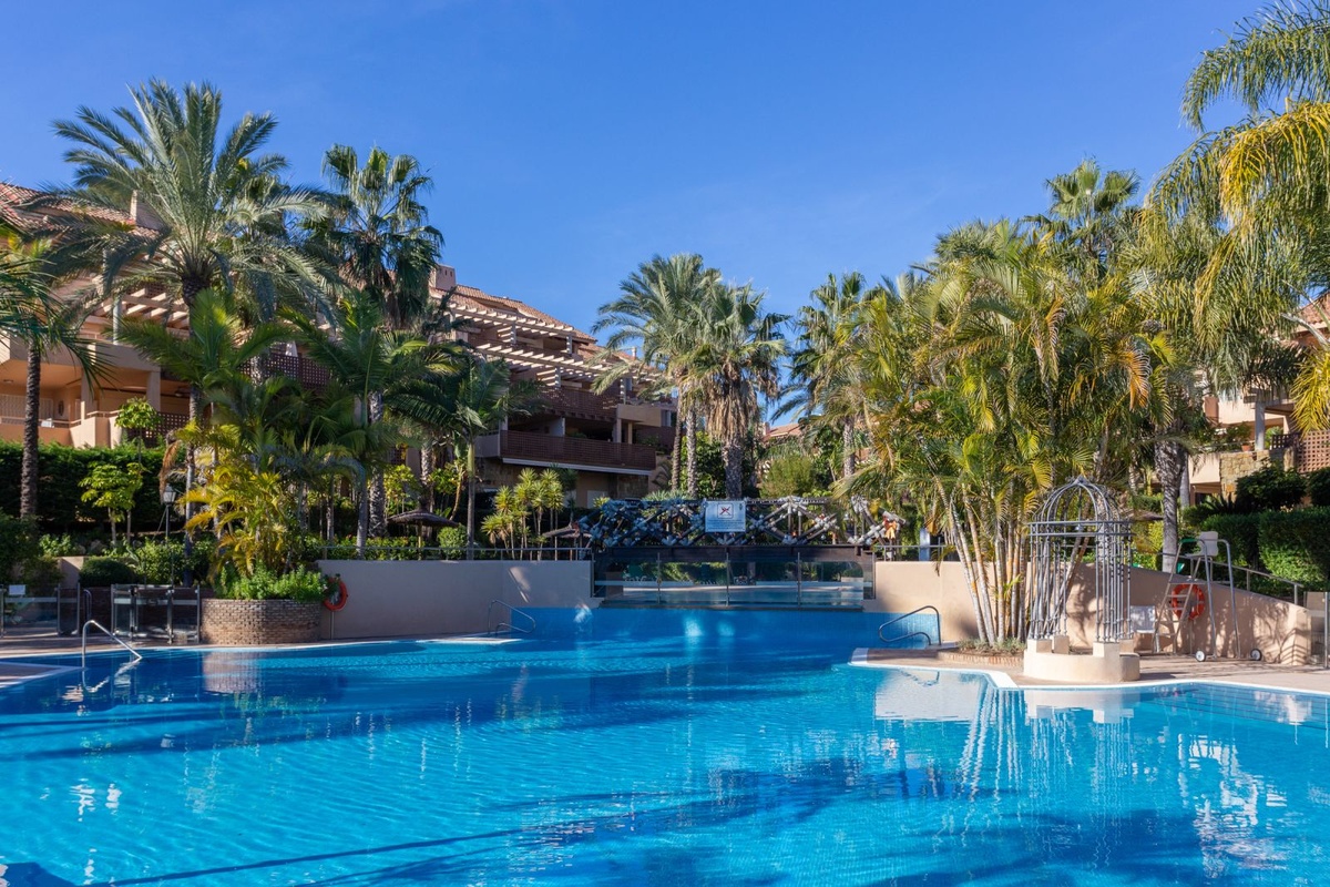 Ubicado dentro de la prestigiosa comunidad Golf Gardens, este elegante apartamento en esquina en el primer piso disfruta de una posición privilegiada en una de las zonas más solicitadas de Río Real, Marbella Este. Diseñada para una vida refinada en la Costa del Sol, la propiedad combina espacio, privacidad y una atmósfera tranquila estilo centro turístico.