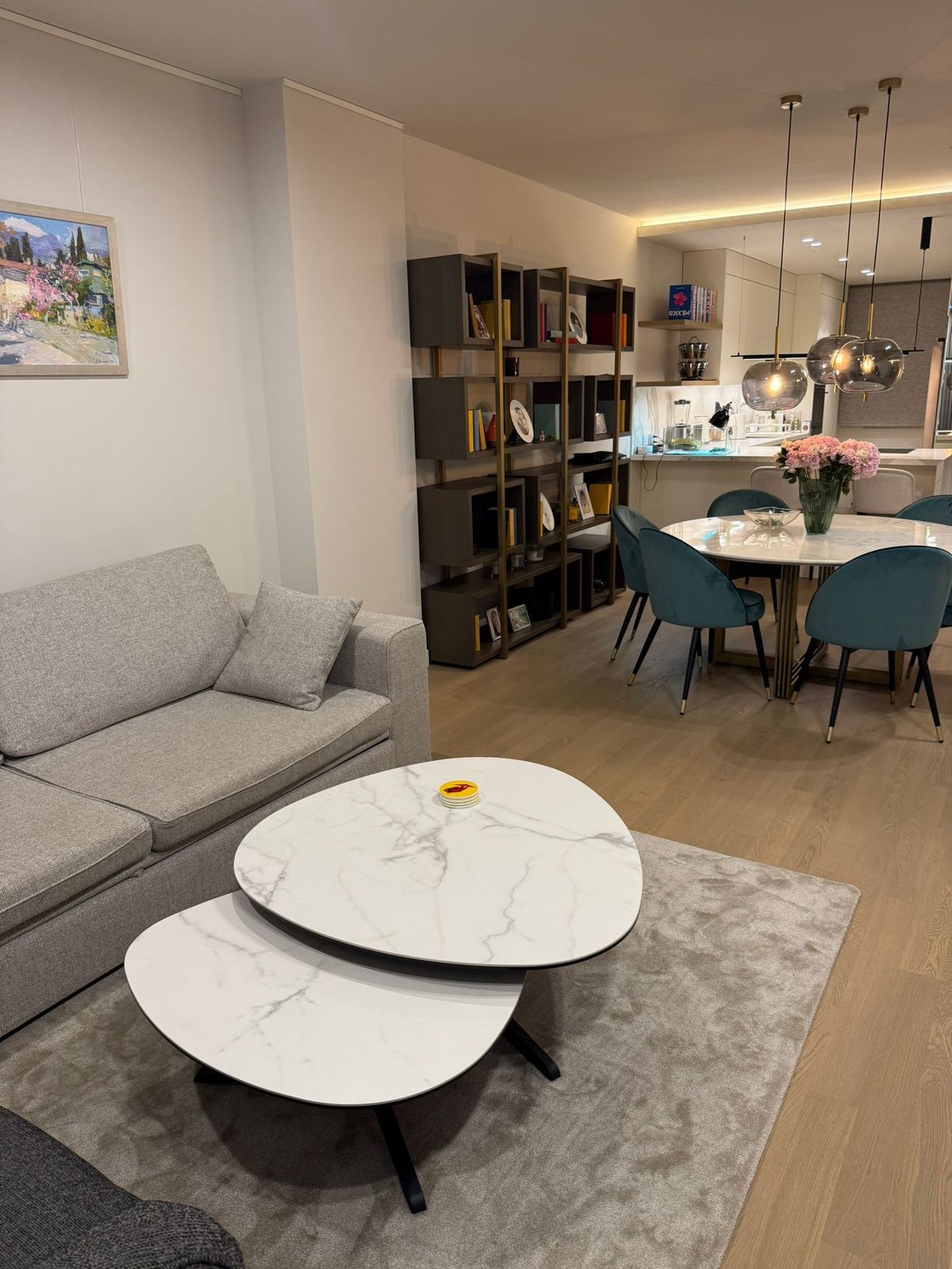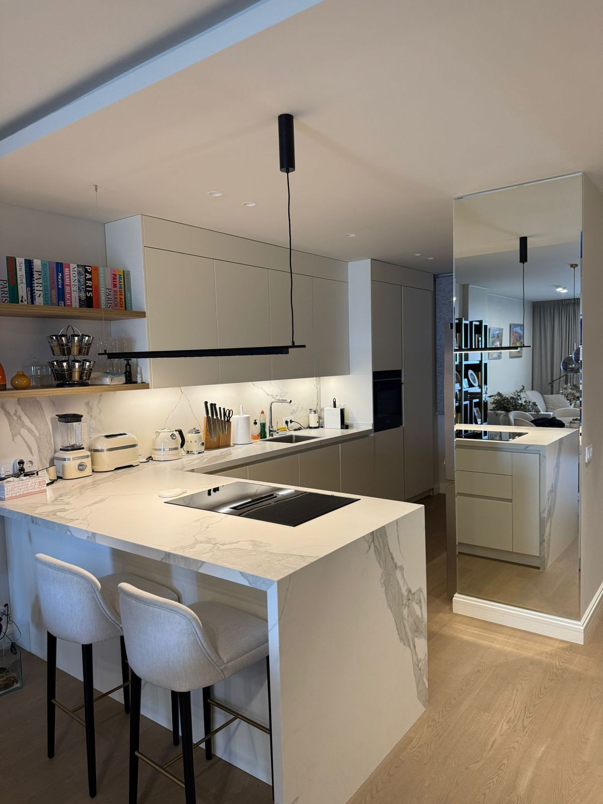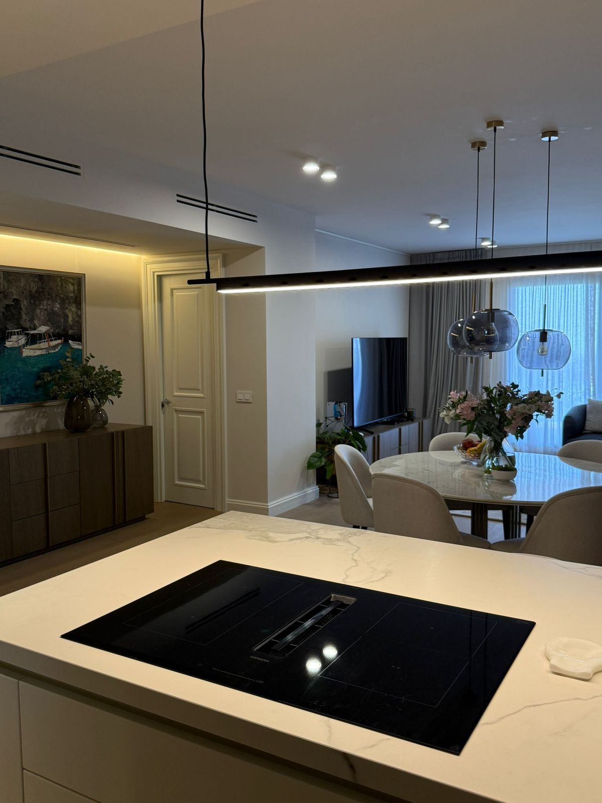 El interior se ve realzado por suelos de parqué de alta calidad, que aportan calidez y uniformidad al espacio. Se ha instalado un sistema de iluminación inteligente automático con sensores, que proporciona comodidad y un toque de lujo moderno.