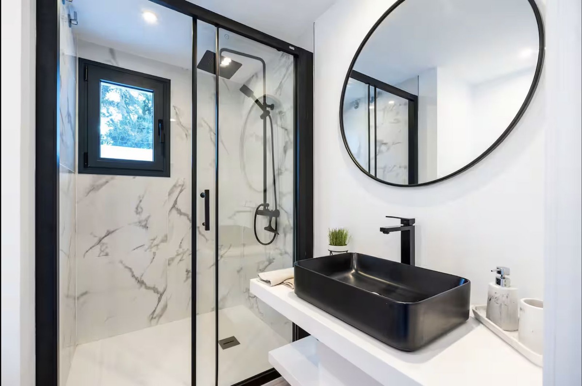 La villa ofrece tres elegantes dormitorios en suite, cada uno con baño privado y vestidor, creando espacios íntimos y llenos de comodidad. Además, cuenta con un aseo de invitados para mayor practicidad.