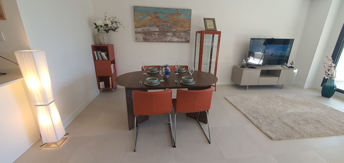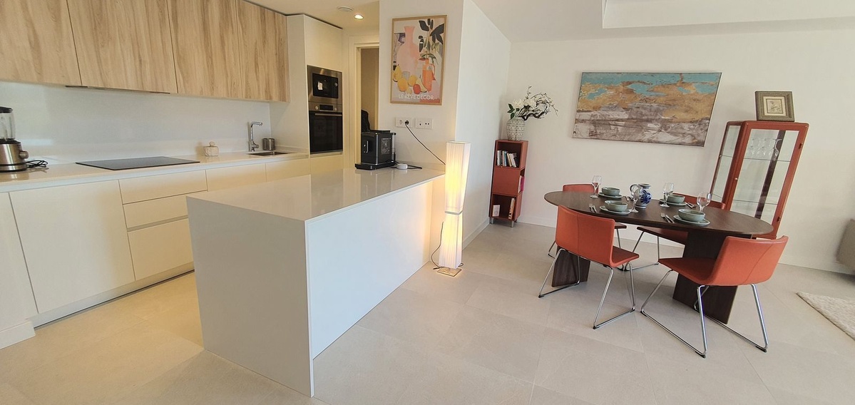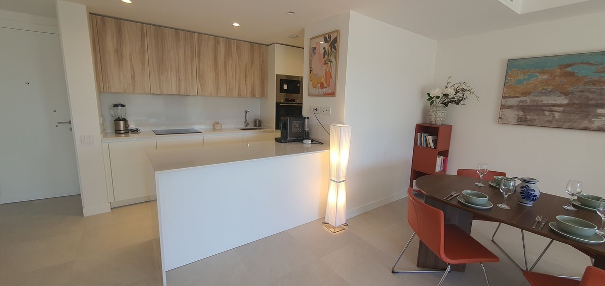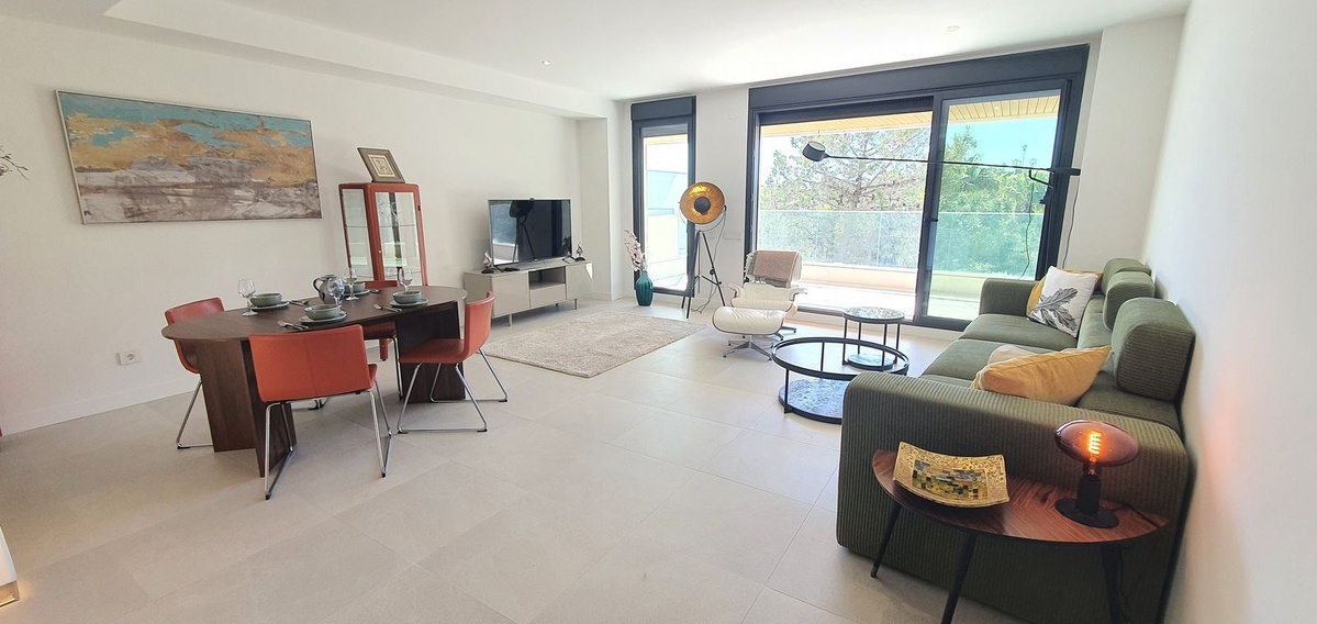 El apartamento cuenta con un amplio salón-comedor de concepto abierto que se integra perfectamente con una generosa terraza, ideal para relajarse, recibir invitados o disfrutar de las puestas de sol con vistas al mar. Los grandes ventanales de suelo a techo potencian la entrada de luz natural y enmarcan la vegetación circundante y la costa.