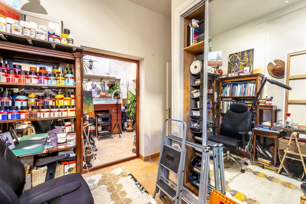 Off the dining and living room, there is a high quality, large and modern kitchen, fitted with Bosch appliances. The long and wide hallway leads to the second bedroom, also of a good size, a downstairs shower room and additional atrium room, currently serving as an artist’s studio.