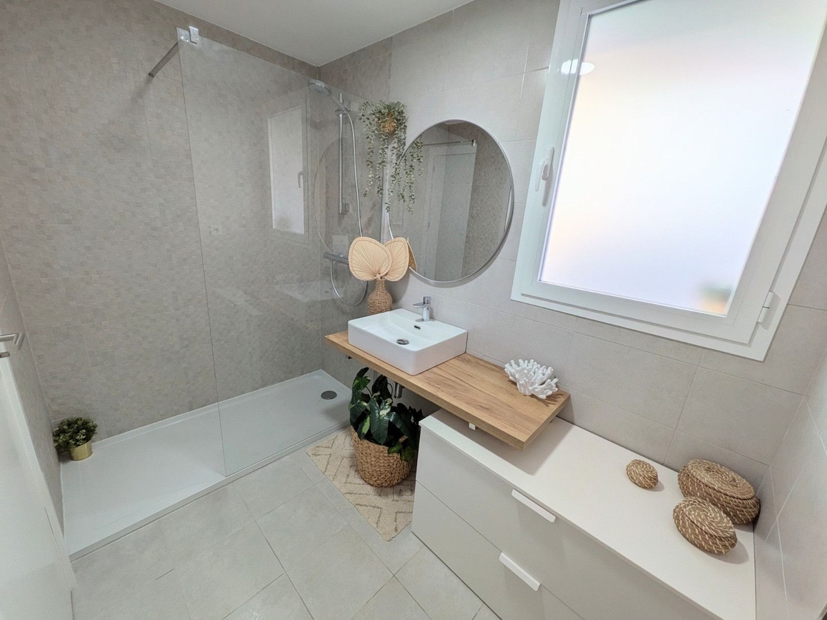 Upon entering the main floor, you are welcomed by a spacious and luminous living–dining area that seamlessly extends onto a semi-covered terrace. This inviting outdoor space is ideal for enjoying the Mediterranean climate while taking in unobstructed views of the sea, the mountains, and the city. The property also features a modern, independent kitchen equipped with high-end appliances and complemented by an exterior laundry room, offering both style and practicality. The sleeping area includes three comfortable bedrooms—two of them doubles—with one hosting an en-suite bathroom. A second full bathroom provides additional comfort, making the layout perfectly suited for families or guests.