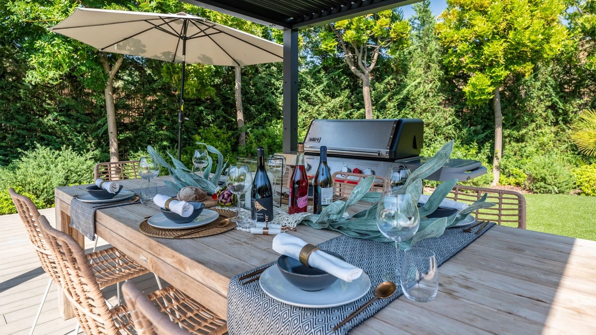 The upper level holds the calm bedroom suites, each with a king bed and direct terrace access. Outside, you find a private pool, manicured lawns and a shaded dining area with a BBQ. The lower level has a cinema room, a second lounge, a bar area, a workspace and a small wellness zone for yoga or light training.