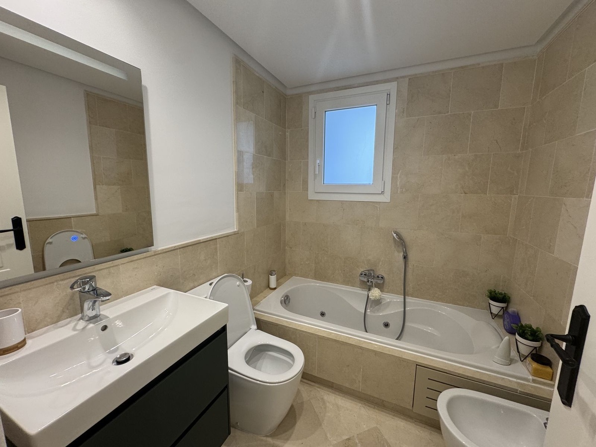 Beautiful, new, modern, fully furnished apartment with sea and mountain views for sale. Two spacious bedrooms, 2 bathrooms, sunny living room. All rooms have access to a spacious terrace (37m) facing south-east. A good parking space and storage room are included in the price. The complex has a modern gym, swimming pool, beautiful garden and security.
