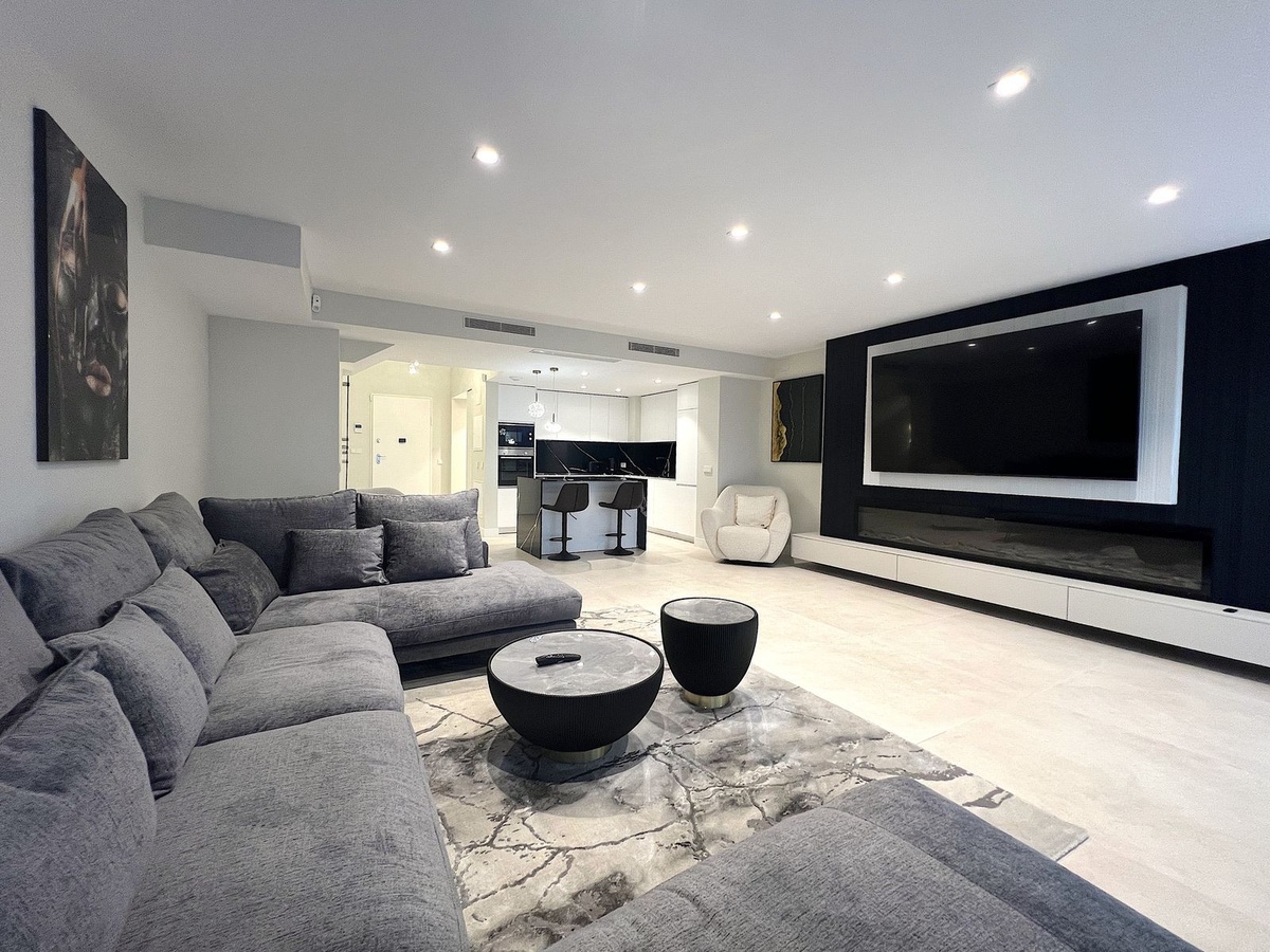 The heart of the home is a bright, open-plan space where the designer kitchen, featuring white cabinetry, onyx marble accents, a central island, and Bosch appliances, flows seamlessly into an elegant living room dominated by a full-wall gas fireplace. From here, you can access a spacious south-facing terrace, perfect for watching the sunsets and enjoying the sun throughout the day.