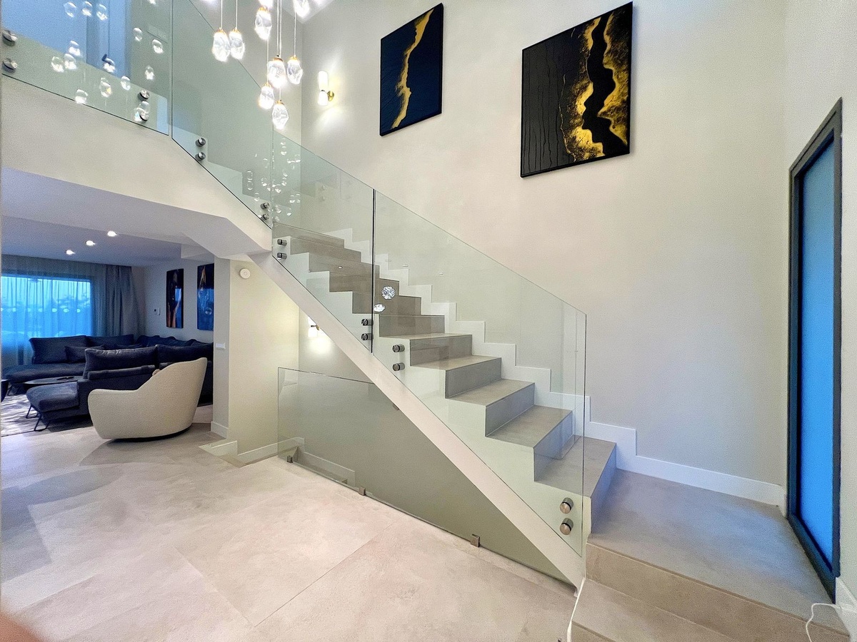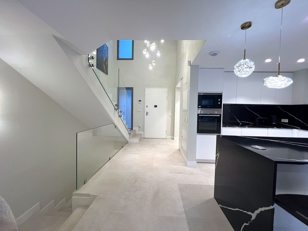Nestled in a contemporary residential development, surrounded by pine forests and adjacent to a prestigious golf course, this corner townhouse captivates with its sophisticated architecture, comfort, and privileged lifestyle. From the moment you step inside, a majestic entrance hall with high ceilings, a designer chandelier, and a glass staircase hints at the property's unique character.