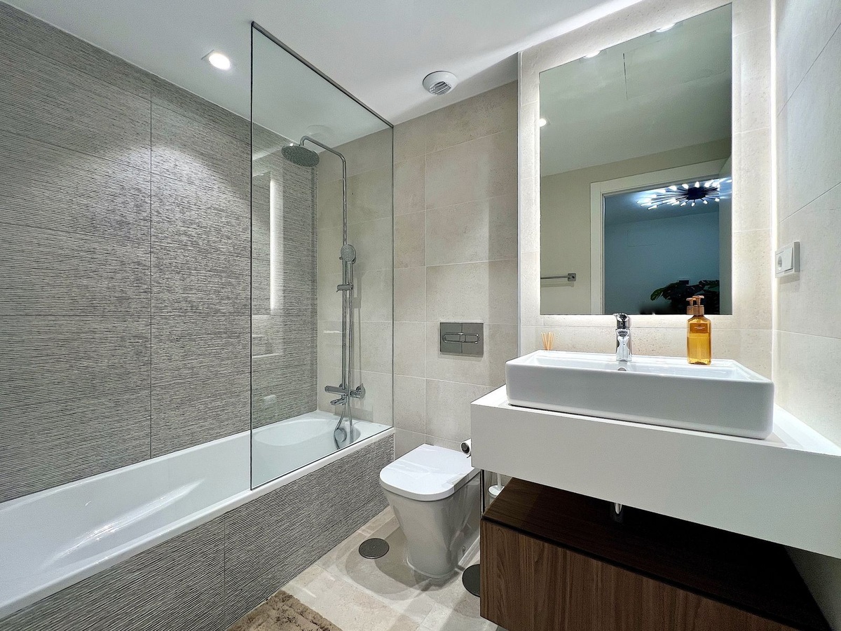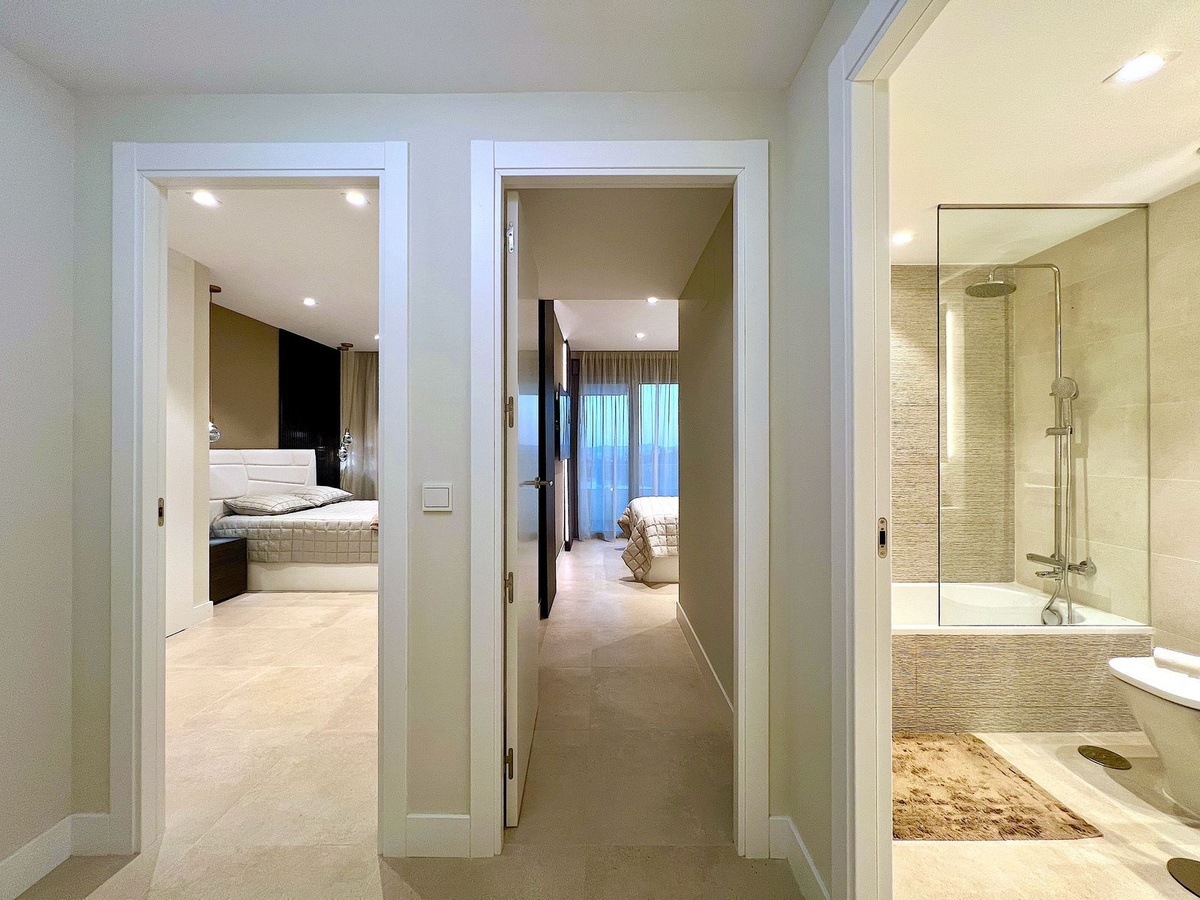 Upstairs, three bedrooms in neutral tones with built-in wardrobes offer direct access to a private terrace with sea views. The minimalist-inspired bathrooms combine natural wood with walk-in showers, creating a serene and contemporary atmosphere.