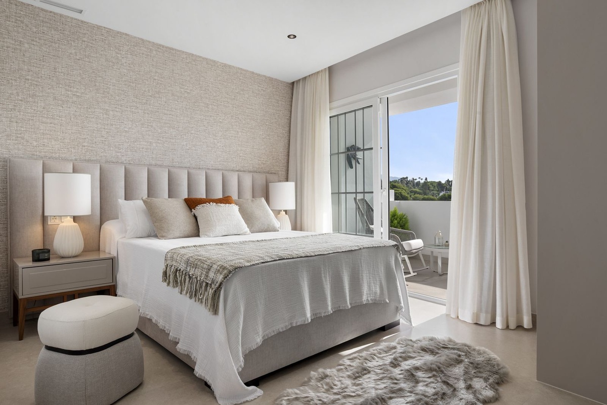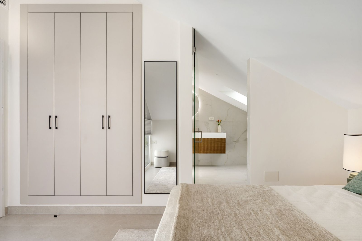 El ático incluye cinco dormitorios muy bien diseñados, incluyendo una espectacular suite principal en el nivel superior. Con techos inclinados, un amplio walk-in closet, un baño inspirado en el spa, y una terraza privada con vistas al mar y la montaña La Concha, este es un oasis de relajación completa. Dos dormitorios adicionales cuentan con baño en suite, mientras que dos comparten un baño familiar moderno. Una quinta habitación flexible sirve perfectamente como un dormitorio o oficina de invitados. Un lavadero separado con acceso a terraza muestra que incluso los detalles prácticos se han prestado la misma atención.
