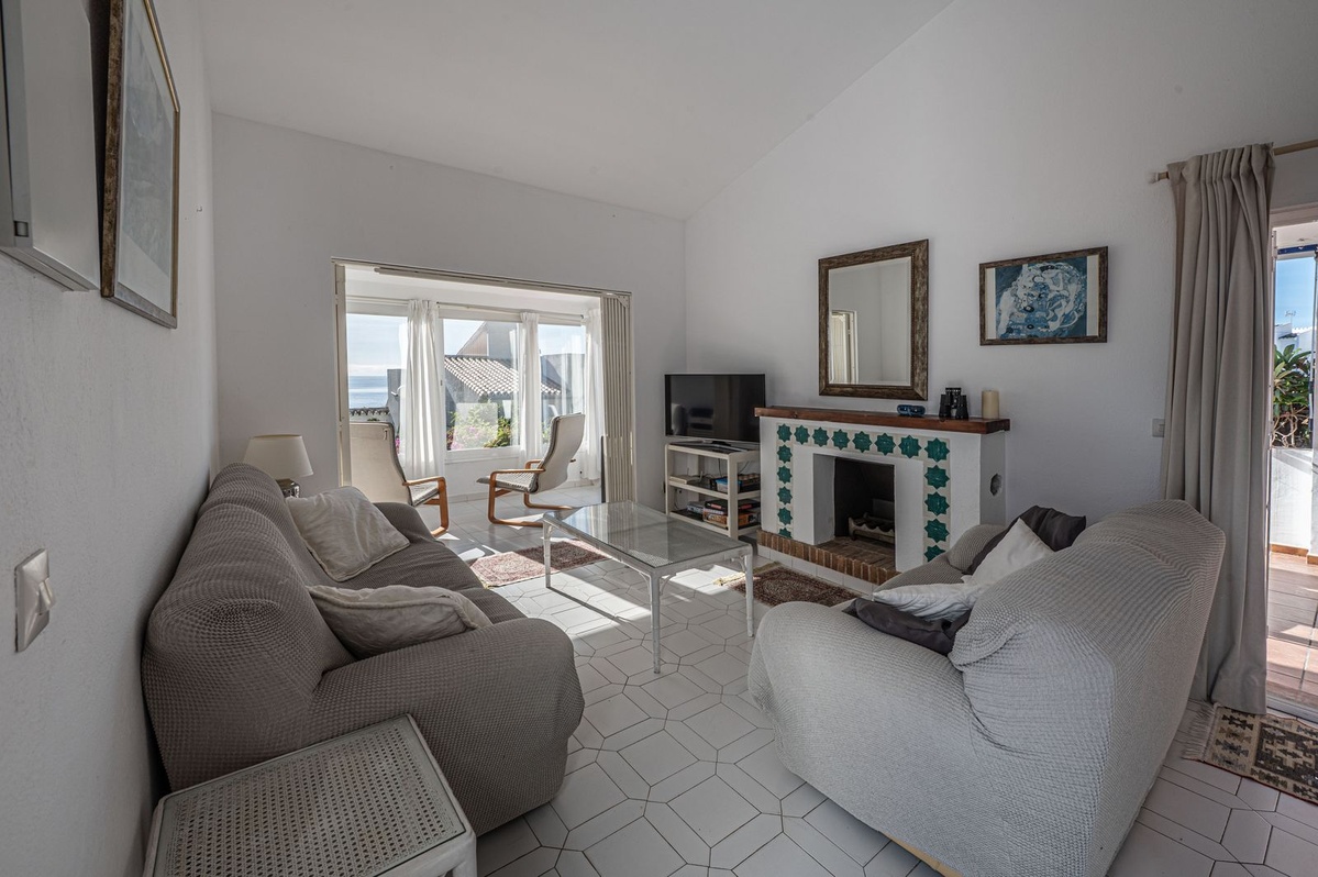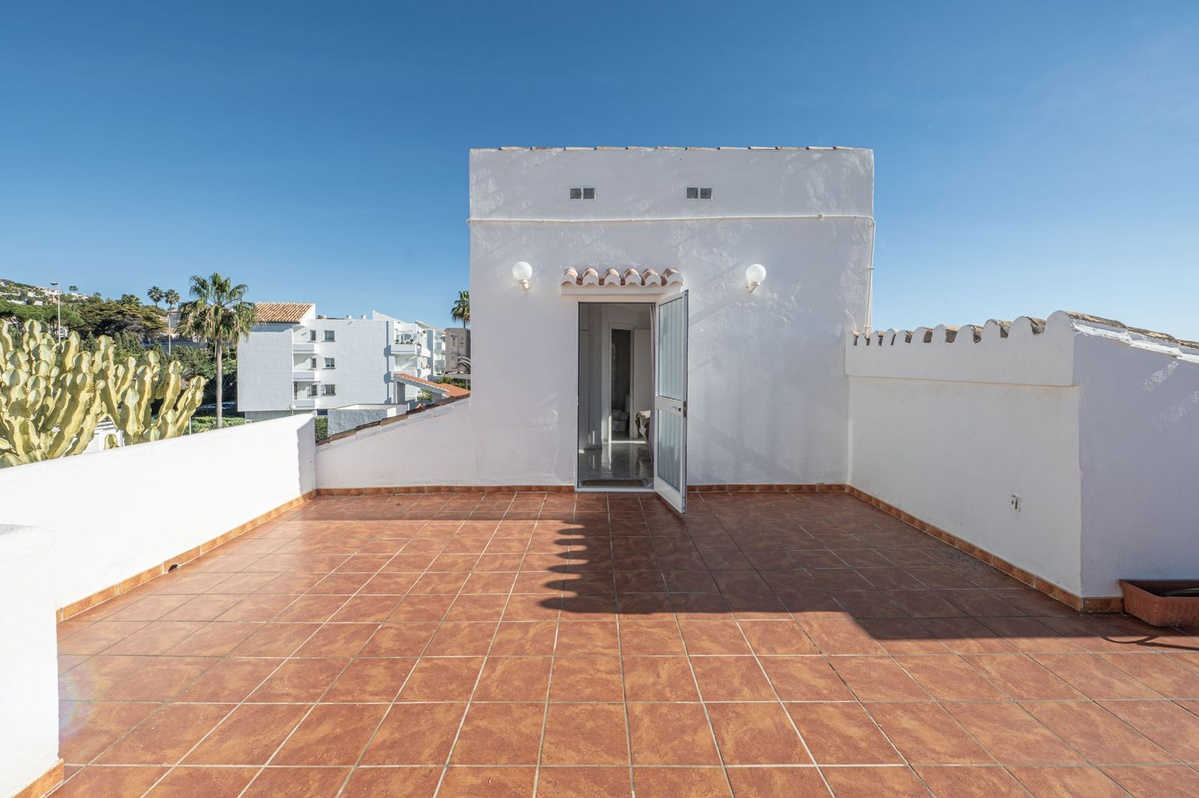La luminosa y amplia zona de estar ofrece hermosas vistas al mar y da acceso a una gran terraza cubierta con vistas a la piscina comunitaria. A la planta superior se accede mediante una escalera exterior, lo que permite que el dormitorio y el baño de arriba funcionen como una suite privada con entrada independiente, proporcionando mayor tranquilidad y privacidad. En la planta superior también se encuentra una terraza privada muy amplia con vistas panorámicas al mar, perfecta para disfrutar de la puesta de sol.