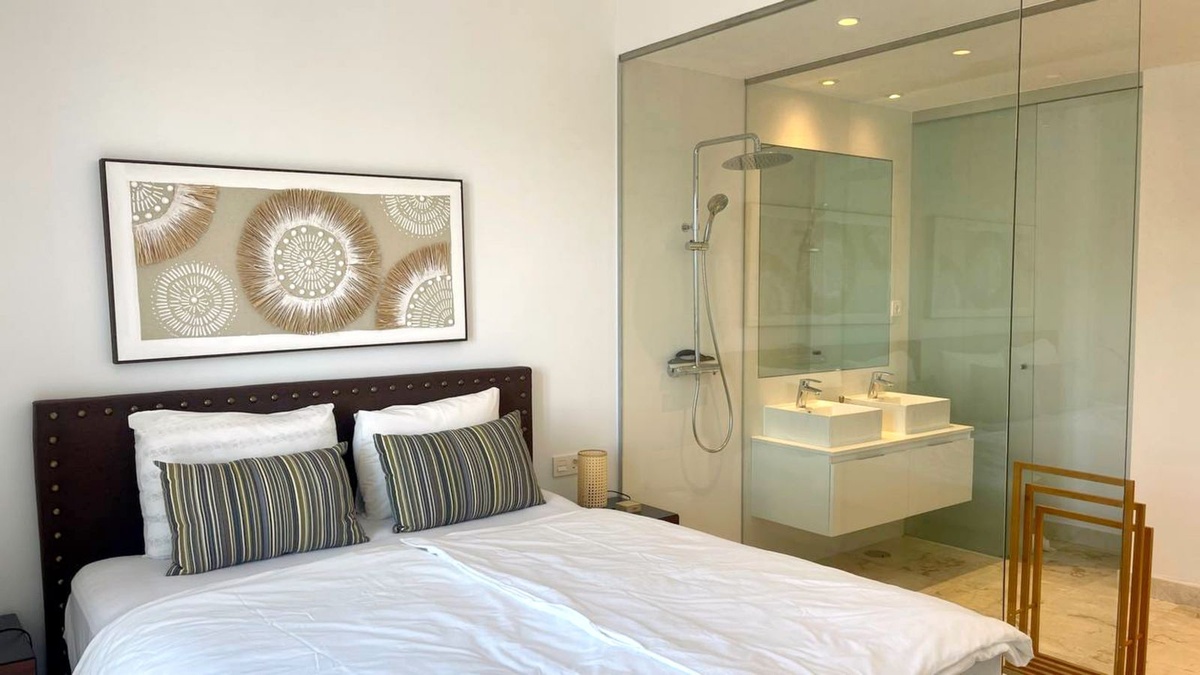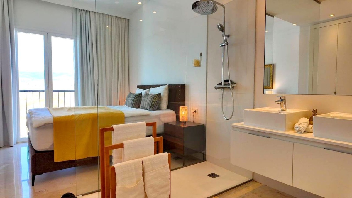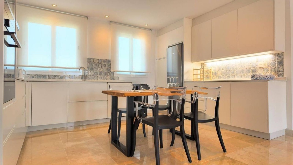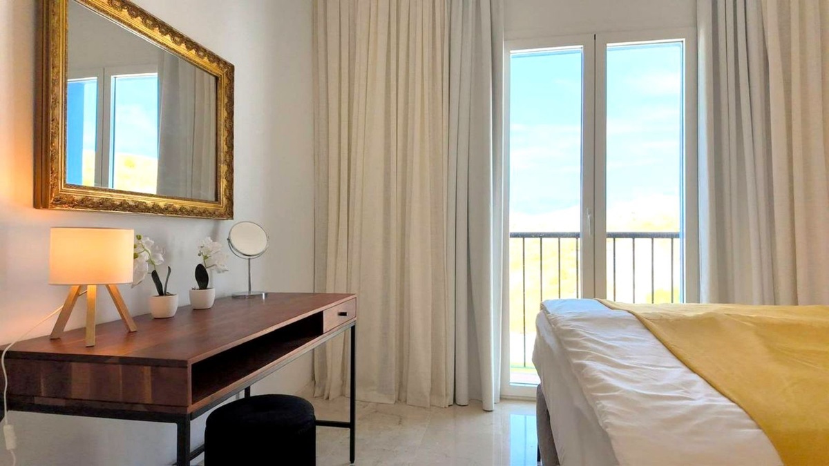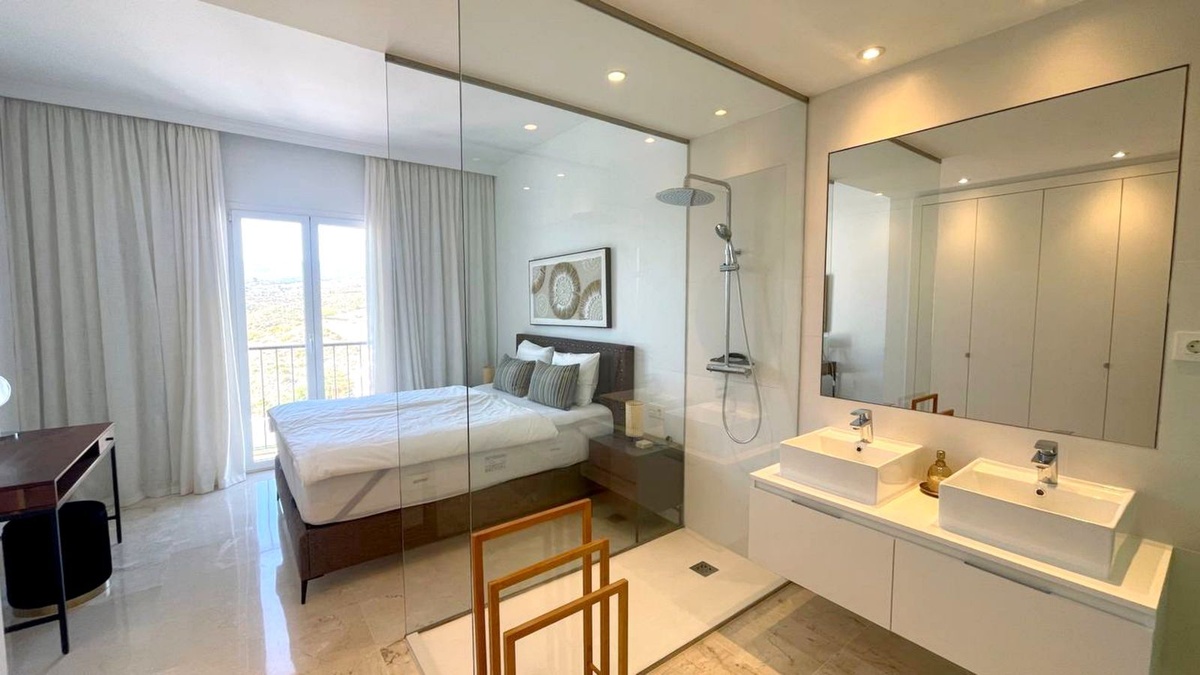Este amplio ático de 2 dormitorios y 2 baños irradia calidez y elegancia. El interior cuenta con un luminoso salón-comedor de concepto abierto conectado a una cocina moderna totalmente equipada con electrodomésticos de alta gama. Sus grandes ventanales y la terraza privada permiten la entrada de abundante luz natural y ofrecen hermosas vistas a las montañas, al mar y al paisaje mediterráneo.