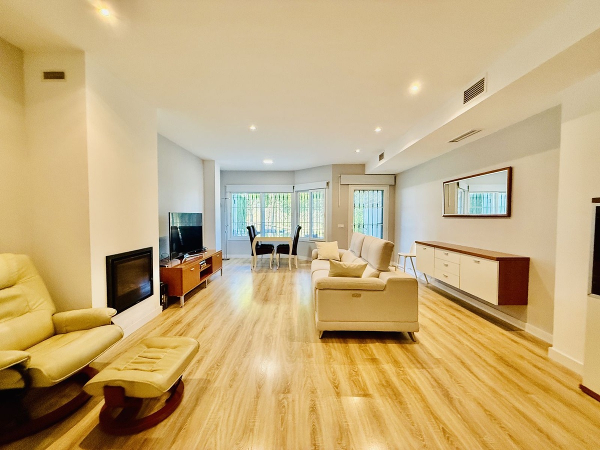 En planta principal accedemos a la vivienda a través del porche ajardinado, ya en ella un espacioso salón comedor con chimenea, cocina abierta totalmente equipada y aseo de cortesía. Acceso directo a la terraza privada con vistas al golf.