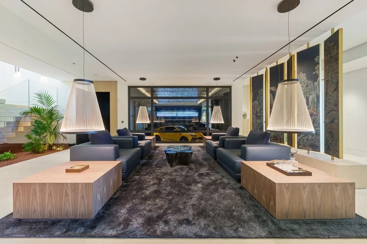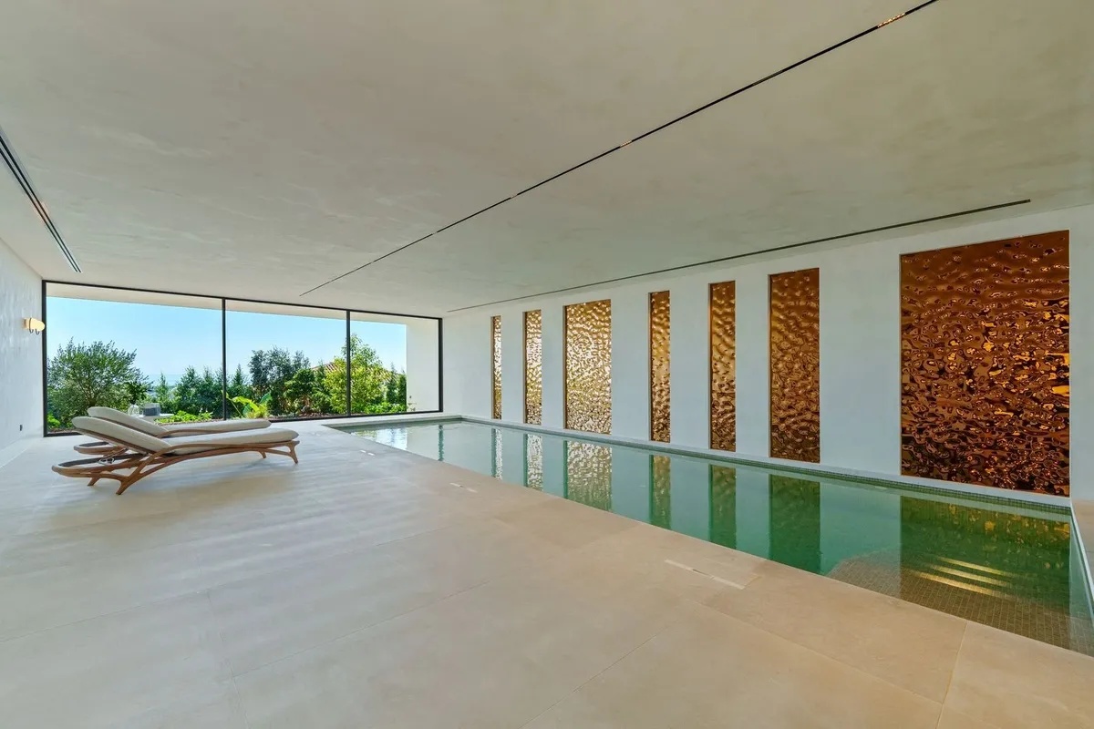 La planta baja de la villa abarca casi 800 m² de refinado espacio habitable, cuidadosamente diseñado para el ocio y la relajación. Grandes ventanales garantizan una abundante luz natural y mantienen la conexión con el magnífico entorno. Aquí descubrirá varios salones, una sala de juegos, una sala de cine, un gimnasio y un completo spa interior con piscina climatizada y jacuzzi. Además, esta planta incluye un despacho, un garaje con capacidad para 8 coches y tres dormitorios con baño privado, uno de ellos con entrada privada y cocina americana, ideal para el personal o los invitados.