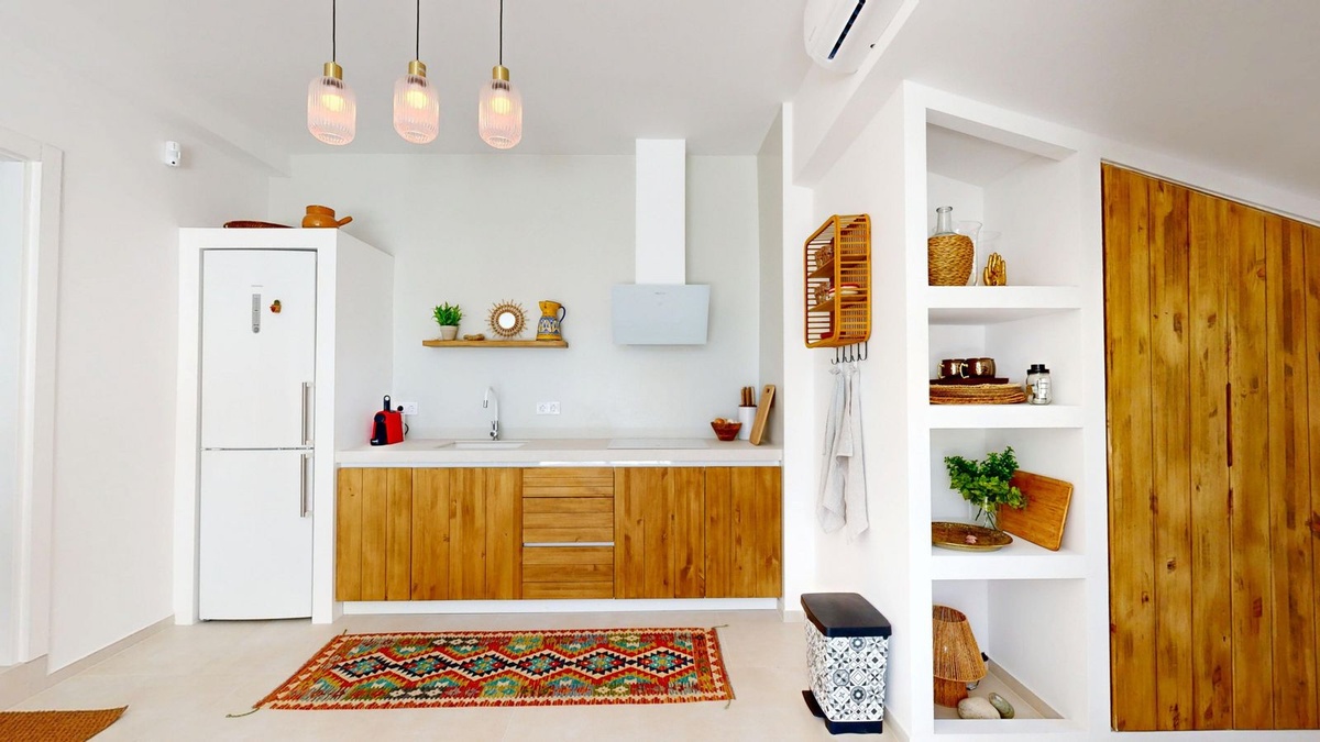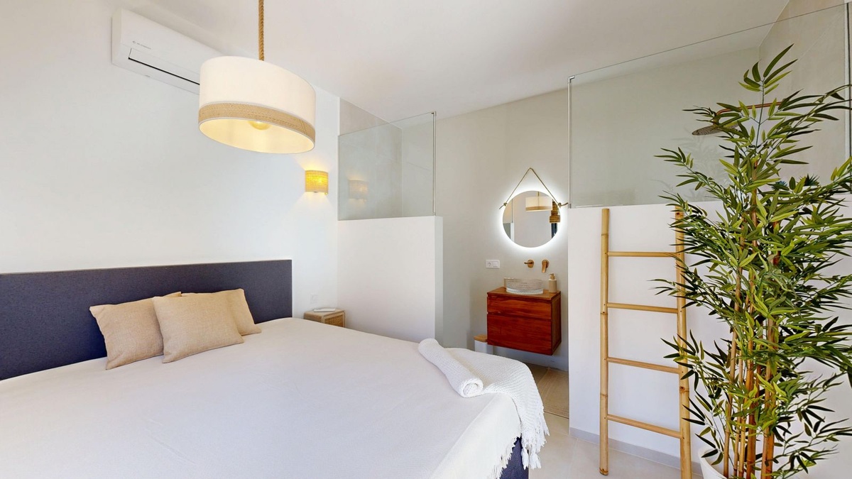A través de un pasillo interior se accede a un apartamento independiente, perfecto para alojar invitados o como segunda vivienda dentro de la misma parcela. Este espacio dispone de un salón-comedor con cocina abierta, un dormitorio con baño en suite y su propio acceso desde el exterior, ofreciendo total privacidad.