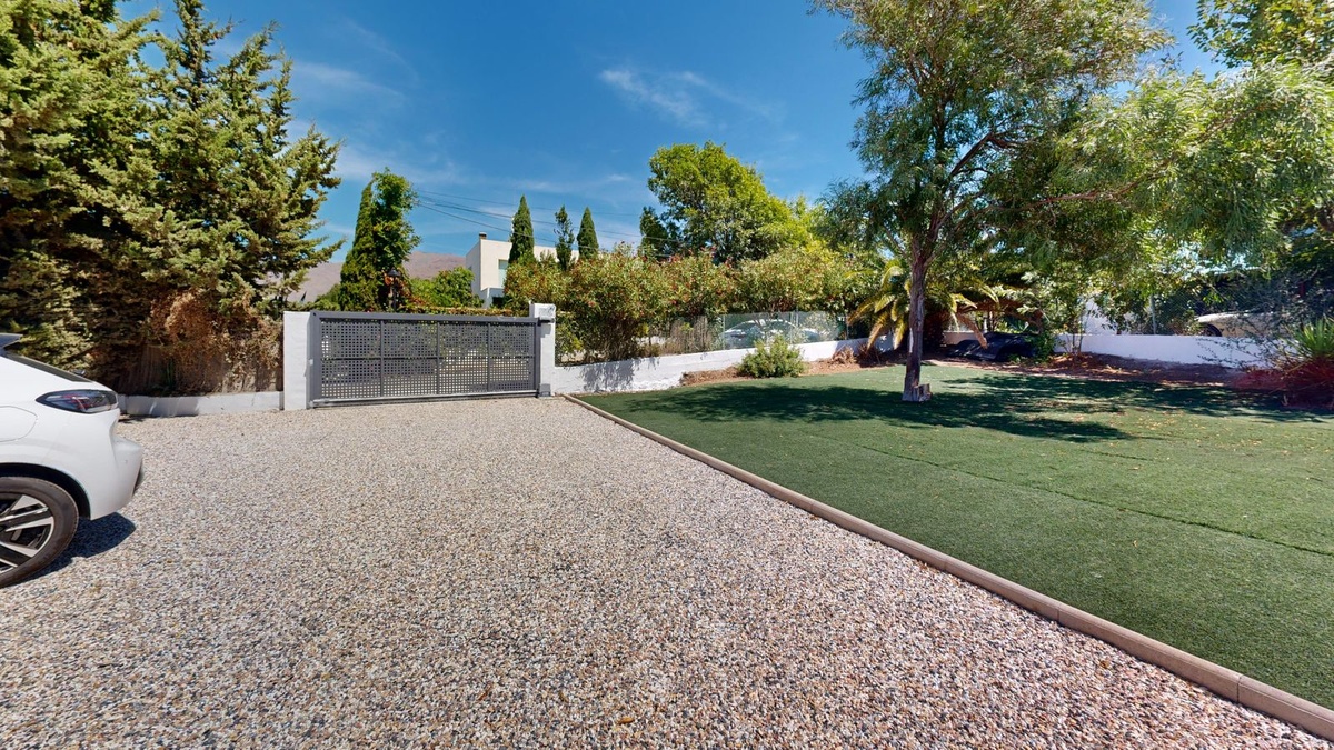 En el exterior, dos portones eléctricos dan acceso a una amplia zona de aparcamiento con capacidad para más de cinco vehículos. La vivienda cuenta con un gran patio parcialmente cubierto, ideal para disfrutar del clima mediterráneo durante todo el año.