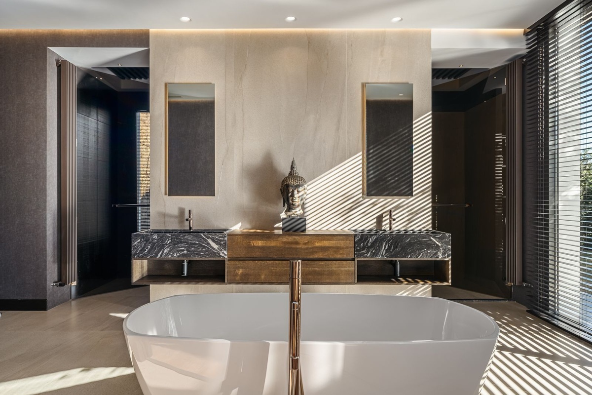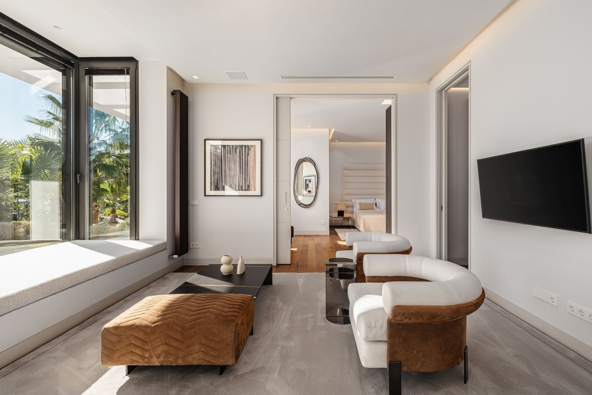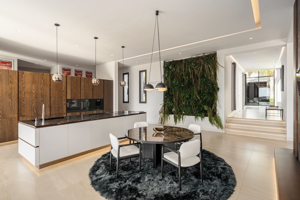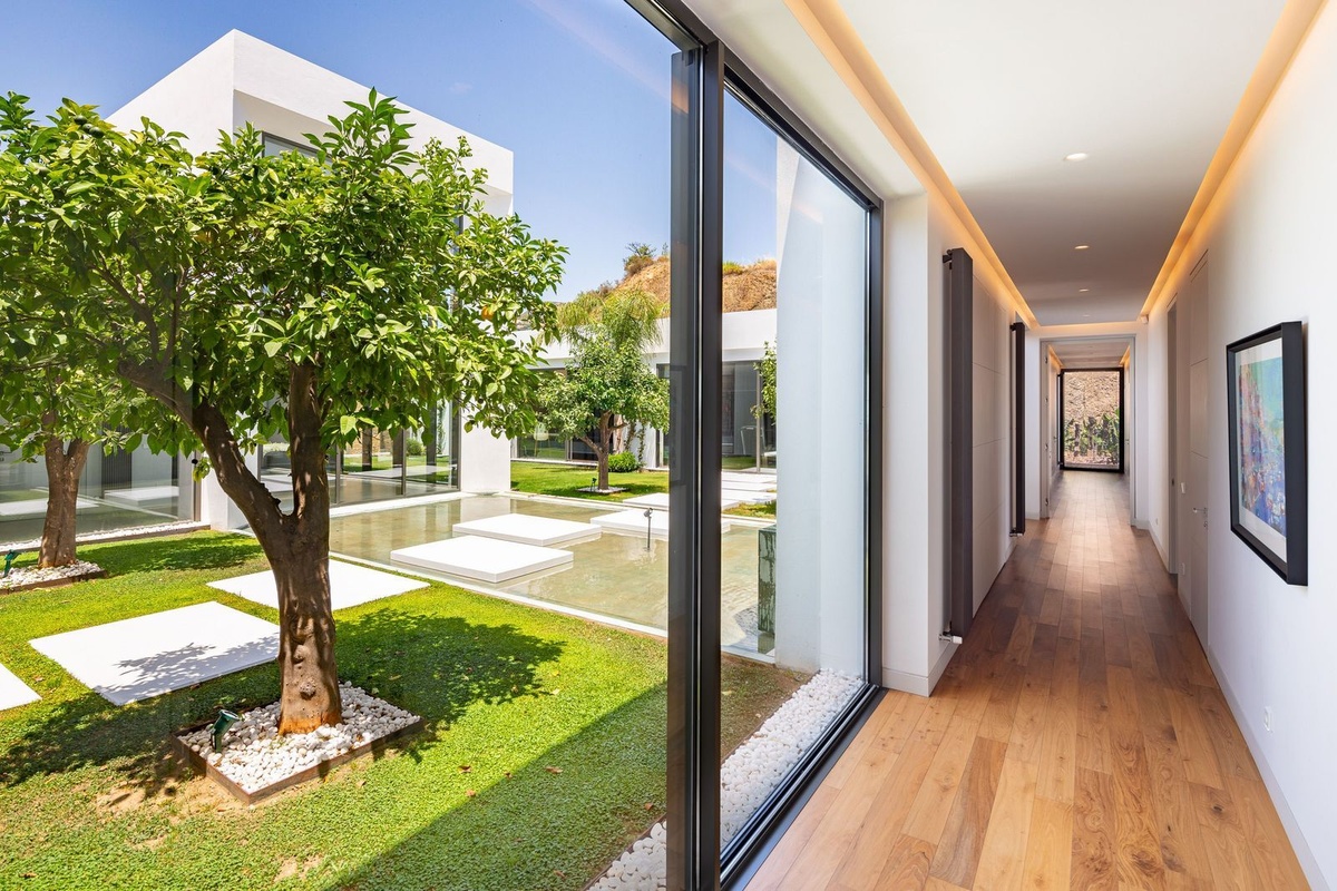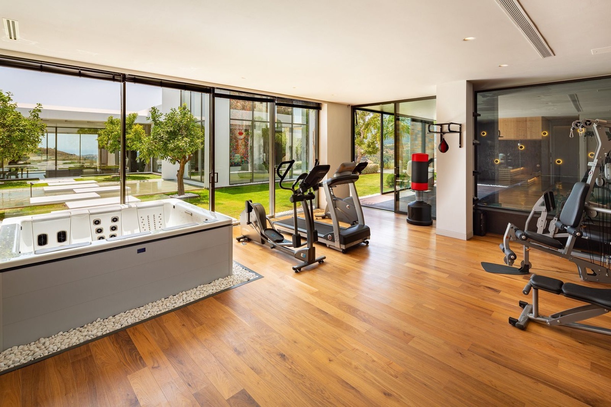 Naast de zes slaapkamers en negen badkamers beschikt dit moderne herenhuis in Marbella over luxe gemakken, waaronder een bioscoopzaal, een fitnessruimte en spafaciliteiten, binnen- en buitenzwembaden, een ruime garage voor zeven auto's en aparte personeelsverblijven.