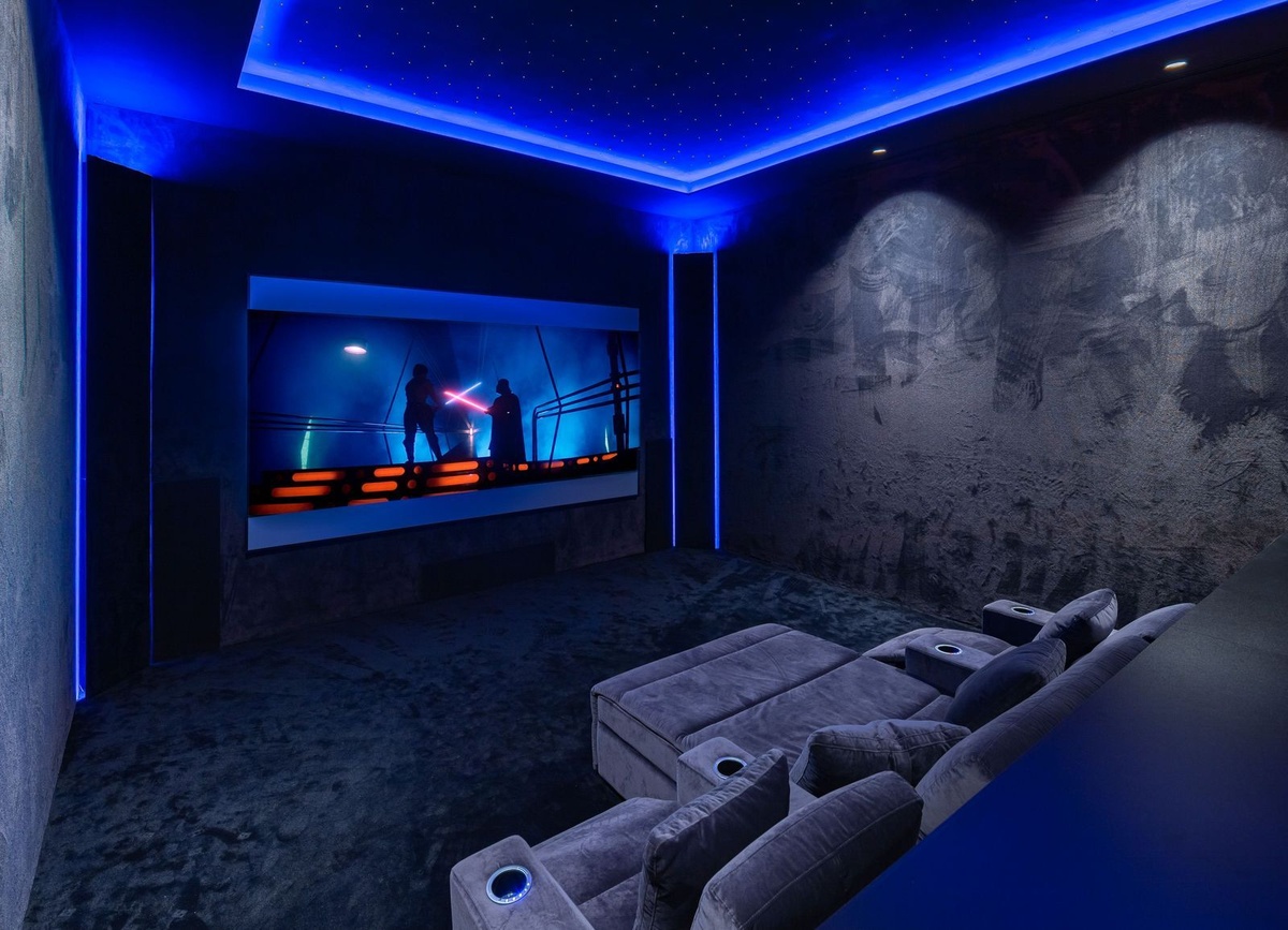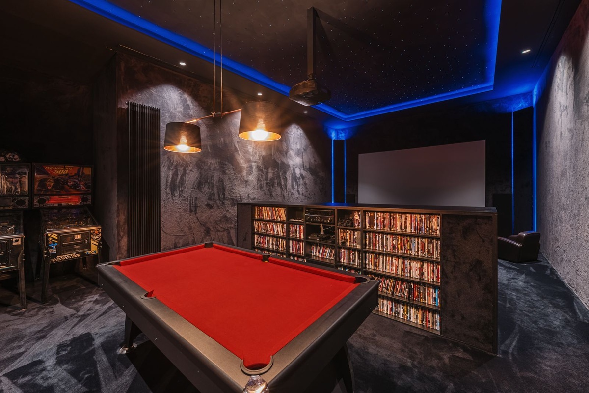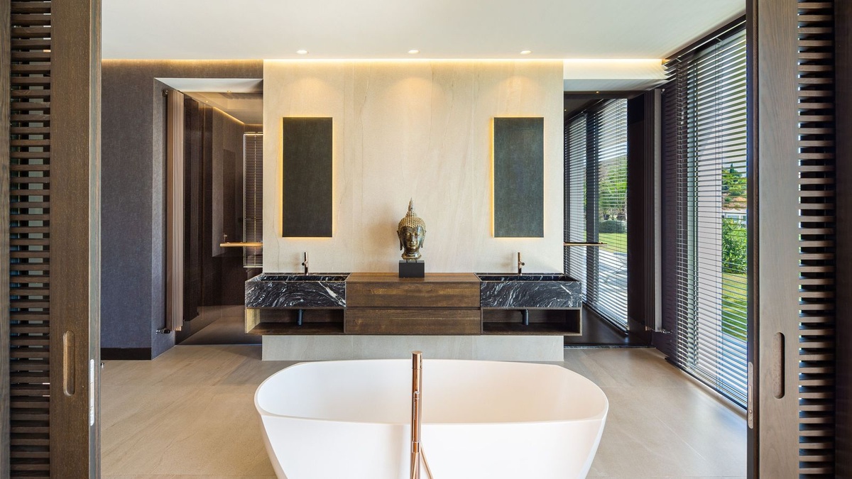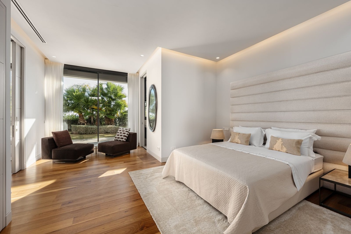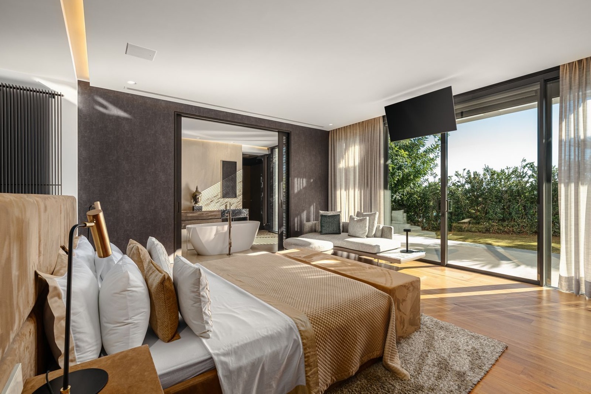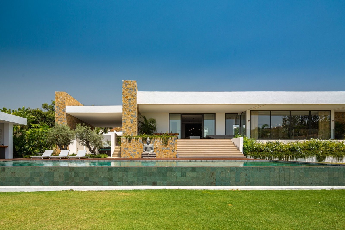 Naast de zes slaapkamers en negen badkamers beschikt dit moderne herenhuis in Marbella over luxe gemakken, waaronder een bioscoopzaal, een fitnessruimte en spafaciliteiten, binnen- en buitenzwembaden, een ruime garage voor zeven auto's en aparte personeelsverblijven.