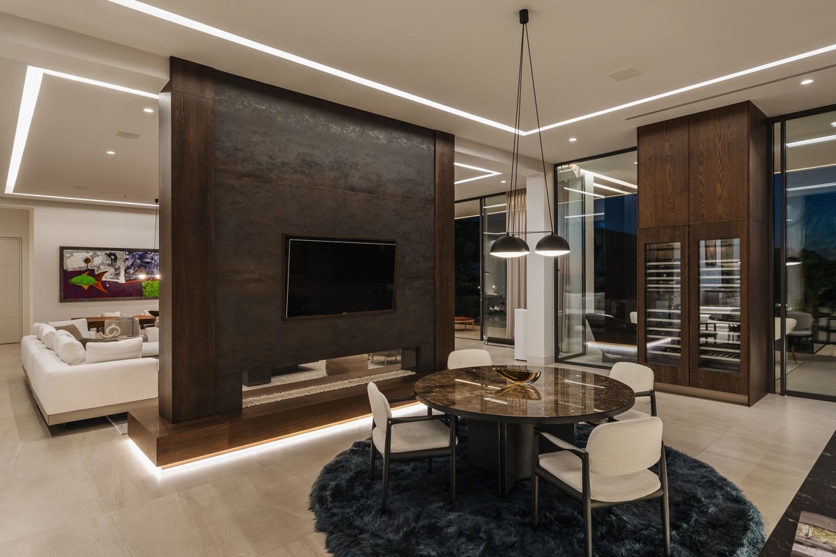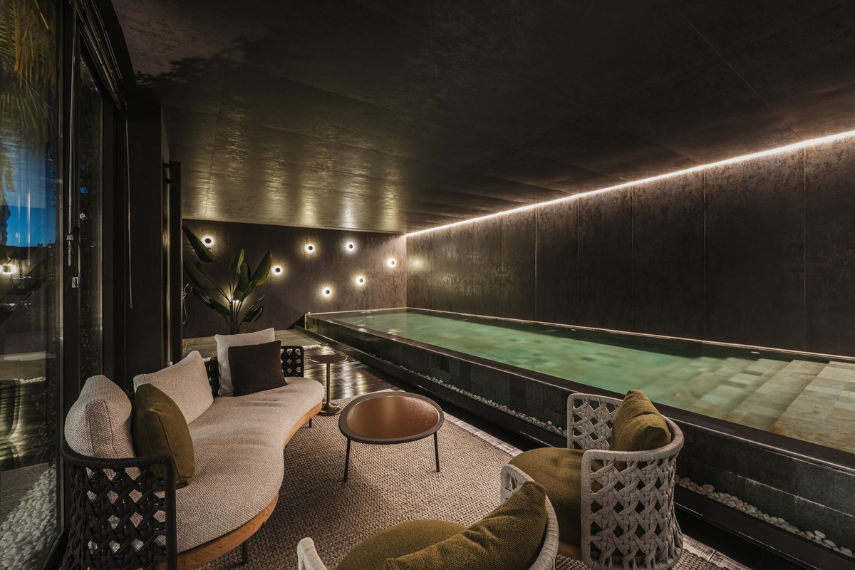 De luxueuze interieurstijl combineert moderne, minimalistische designelementen met enkele klassieke, op de jaren 60 geïnspireerde elementen; zoals donker hout, zachtere texturen en natuurlijke rondingen die zich verzetten tegen de hoekige lijnen van de buitenkant van het pand.