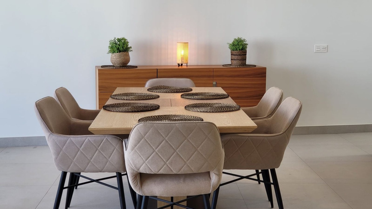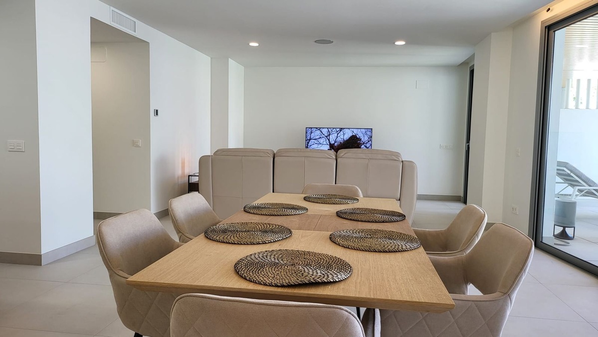 De keuken verbindt zich met de eethoek, waar een grote tafel is met zes stoelen, en met de woonkamer, waar een grote L-vormige, verstelbare, elektrische bank, een nieuwe tv (smart tv) is, onbeperktFi.