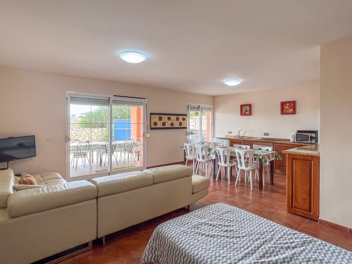 On the ground floor is the fully equipped kitchen which gets an abundance of natural sunlight and is excellent for making delicious meals, as well as the first open-plan dining/living room. From here, there is direct access to one of the terraces, which overlooks the garden and private pool. There is also one bathroom and a bedroom on this floor.