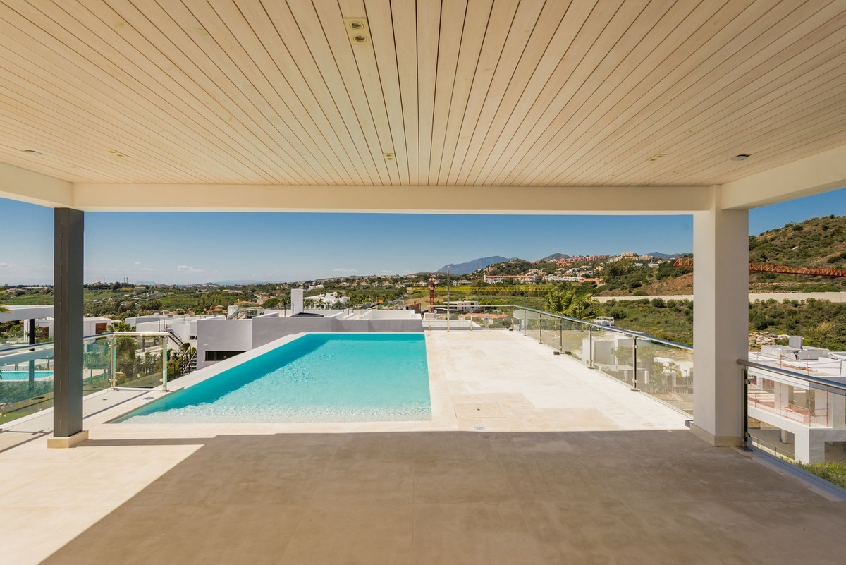 De woonkamer leidt naar een groot overdekt terras en vervolgens een onbedekt terras en het Infinity-zwembad dat voorverwarming heeft voorverwarming.