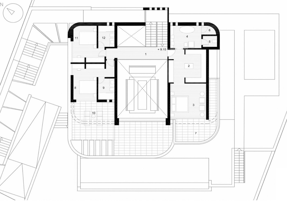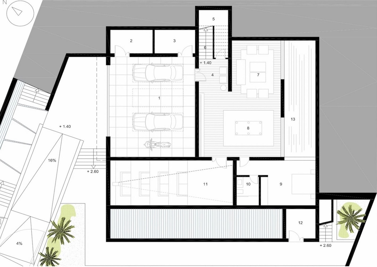 Kelder: garage, installatieruimte, opslagruimte, verdeler, watervalmachinekamer, woonkamer, biljartkamer, 1 slaapkamer met groot raam en daglicht, ensuite badkamer, bioscoopruimte, ruimte voor zwembadinstallaties en een Zen-terras.