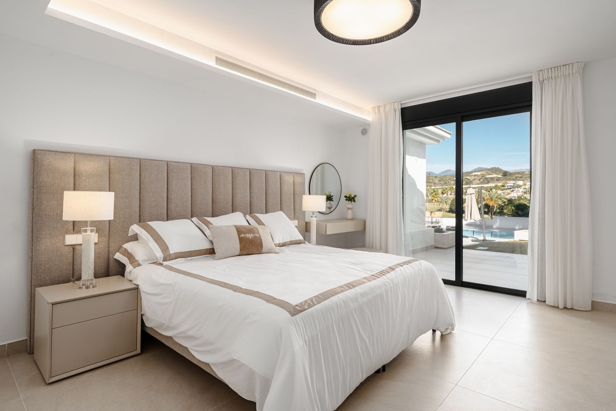 Aan de andere kant van de villa, nog steeds op de begane grond, heeft u 3 grote slaapkamers met en-suite badkamers, en boven een fantastische hoofdslaapkamer met inloopkast, en-suite badkamer en een prachtig uitzicht op de golfbaan.