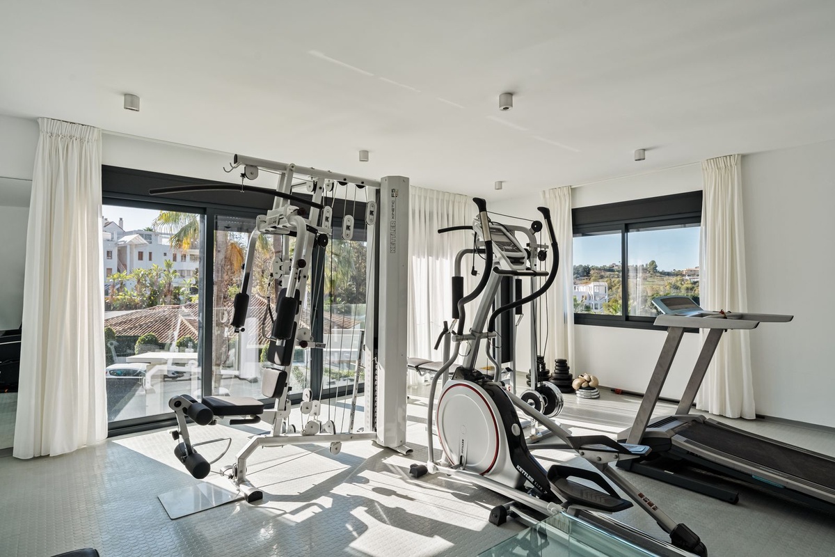 Gelegen boven de garage kunt u uw fitnessroutine naar een hoger niveau tillen in de sportschool met grote ramen die licht en ventilatie mogelijk maken.