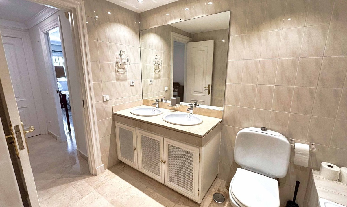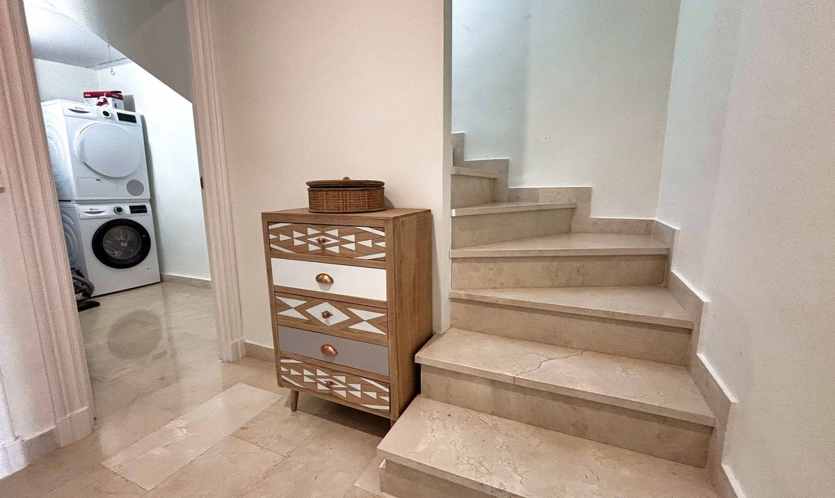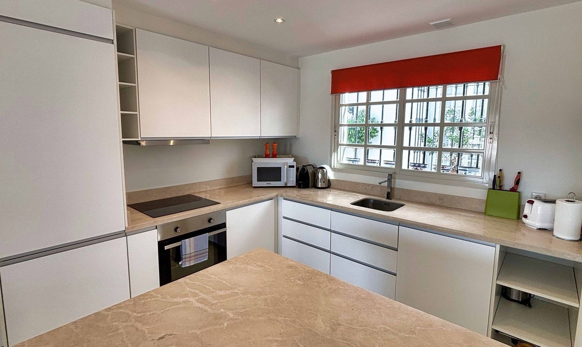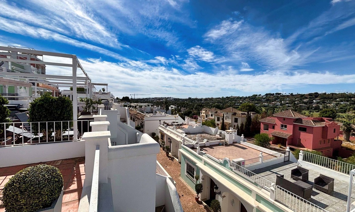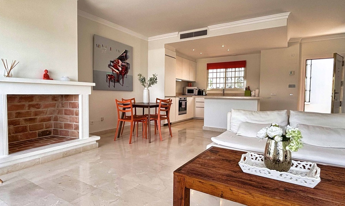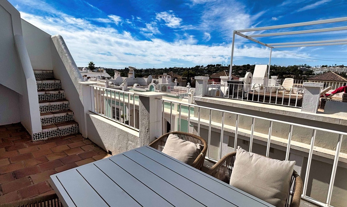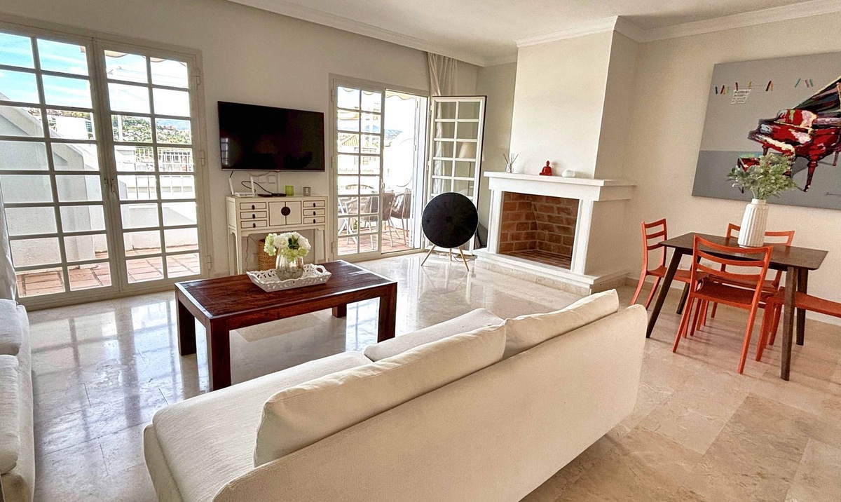 This stunning, fully renovated two-bedroom, two-bathroom townhouse in Aloha Pueblo blends modern luxury with traditional Andalusian style. The spacious living area features a fireplace, and the sleek kitchen comes equipped with top-tier appliances. Both bedrooms have en-suite bathrooms, offering added privacy and comfort. The rooftop terrace boasts panoramic views of La Concha and the Mediterranean, ideal for relaxation or entertaining.