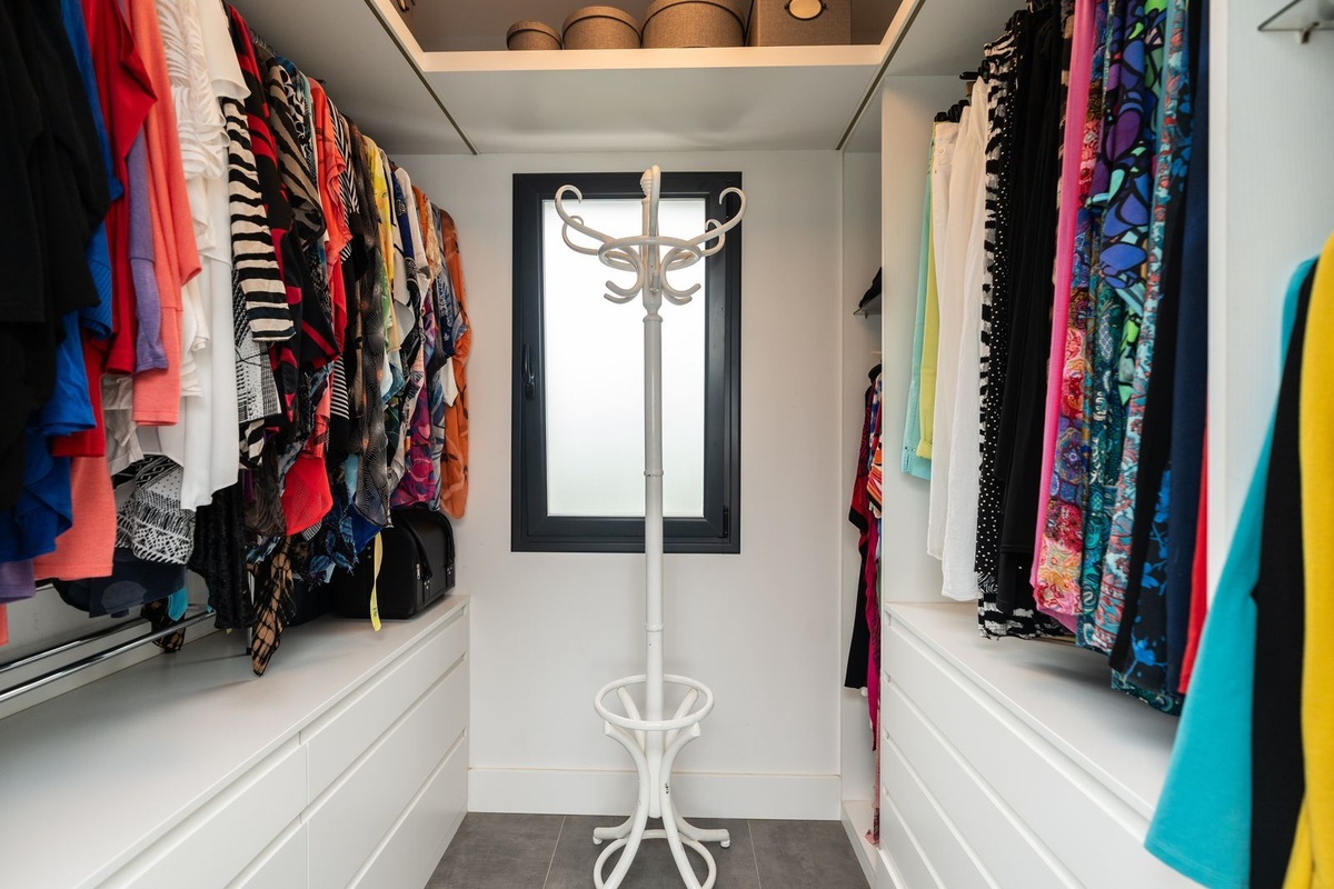 An automatic entrance gate opens to a private driveway and ample parking, leading to the modern home surrounded by recently designed, landscaped gardens that are both water-efficient and in harmony with the natural surroundings. Inside, large windows flood the living room with dining area and open-plan kitchen with natural light. This main living area opens to a generous terrace, partially closable and covered, creating the perfect space for entertaining or unwinding. The terrace flows naturally around the private pool, complete with seating areas and a barbecue spot. There is also a rear terrace that is ideal for a minimalist vegetable garden.