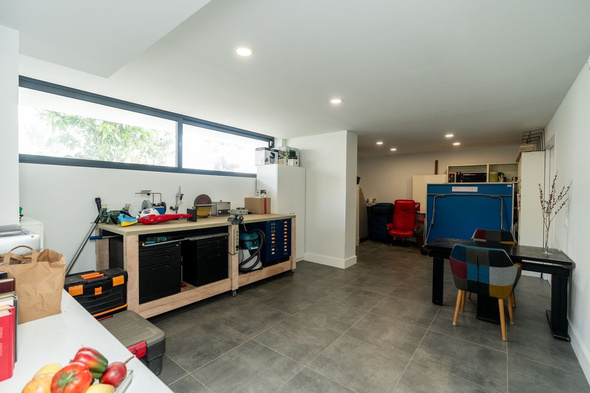The basement is accessible from both inside and outside, making it perfect for use as a private office or artist's studio/atelier or extra bedroom. This level includes two additional rooms for workspace and storage, as well as a laundry room and a hall with convenient guest toilet. The interior patio with palm tree creates a calm, naturally lit ambiance.