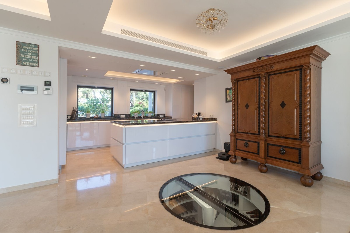 On entrance level the property consists of a fantastic open plan living-dining-kitchen area which leads out to an incredible exterior area with a very large, partly covered terrace, salt water heated pool with thermal blanket cover and an independent, covered, outdoor kitchen. A special feature in the dining area is an amazing wine cellar for 800 bottles, built into the floor, which is maintained at a constant temperature by an independent aircon machine.