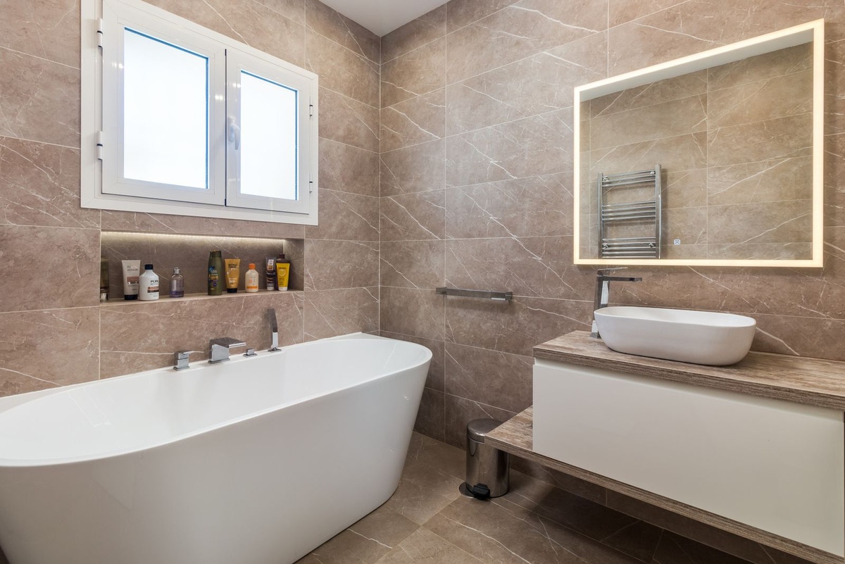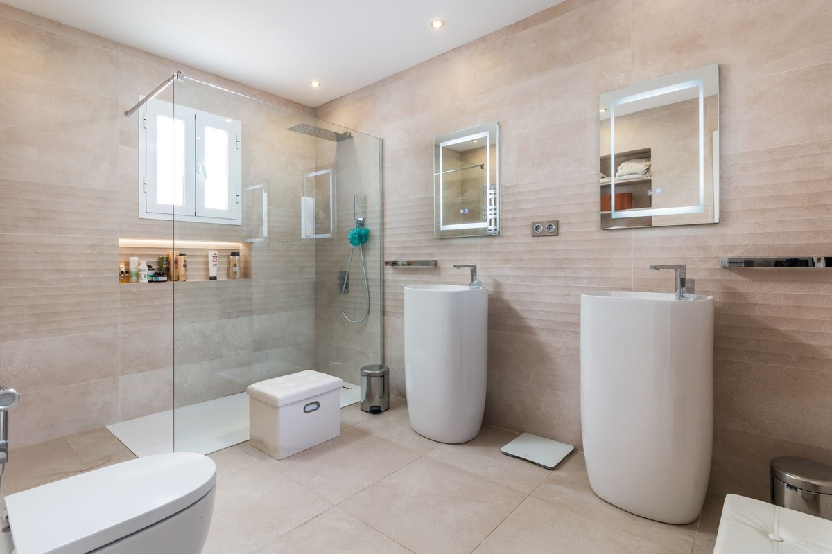 The villa’s outdoor spaces are equally impressive, designed for the ultimate Mediterranean lifestyle. A private swimming pool takes centre stage, surrounded by a beautifully maintained garden with panoramic views of the mountains and countryside. Adjacent to the pool, a poolside house features an outdoor kitchen and living area, ideal for al fresco dining and entertaining. The expansive private terrace provides further opportunities for outdoor relaxation, while the automatic irrigation system ensures the garden remains lush and vibrant year-round.